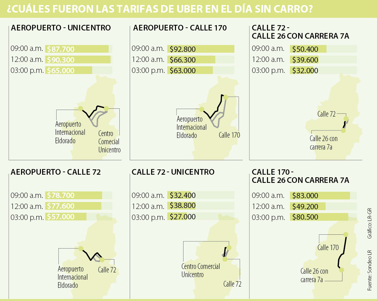 Un sondeo de LR encontró, por ejemplo, que una carrera desde la Calle 170 hasta el Aeropuerto Eldorado, que habitualmente tiene un costo que oscila entre $25.000 y $30.000, en este día sin carro tuvo un valor de $92.800, con la medición en hora pico.