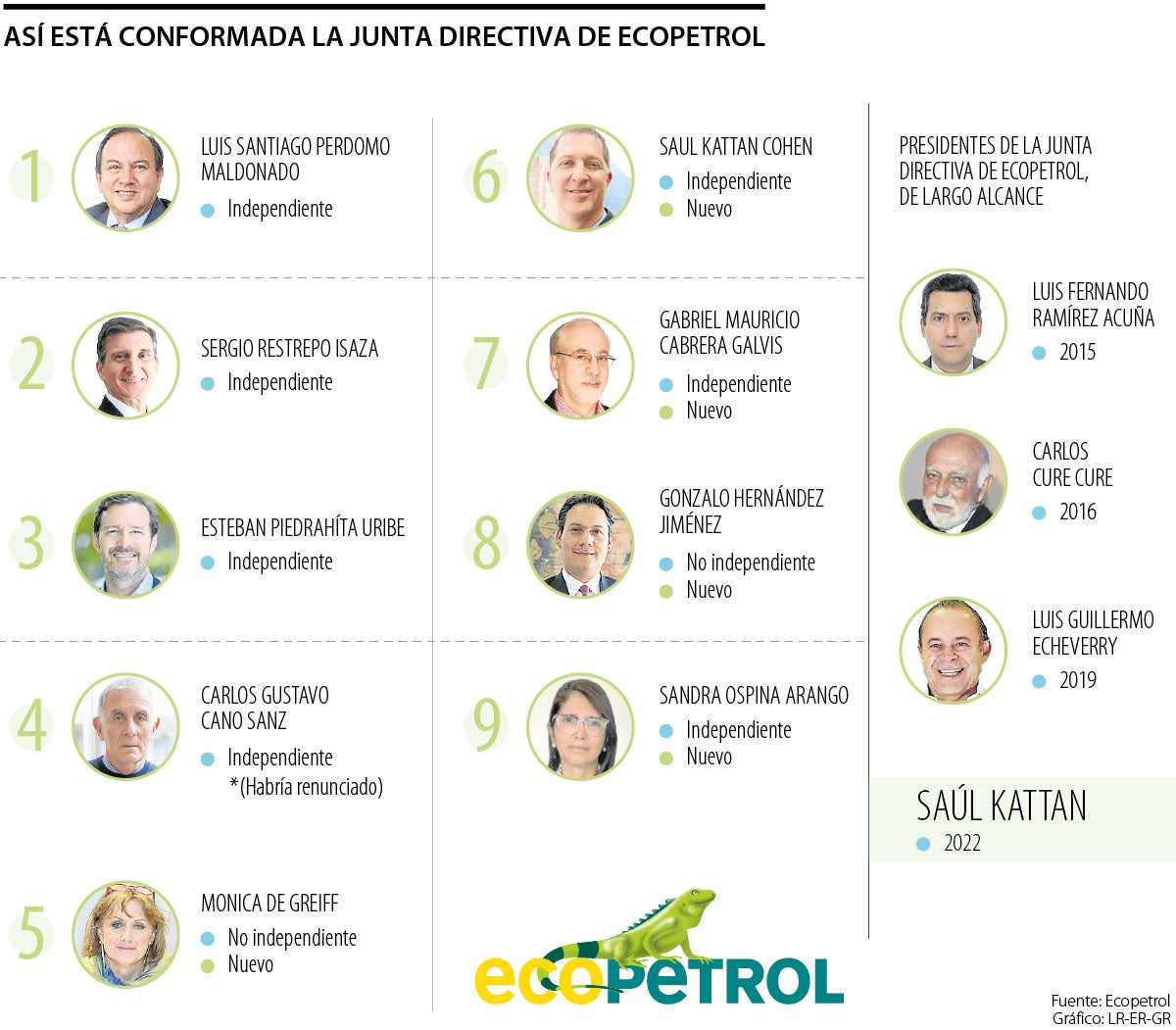 En octubre del año pasado, tras una reunión extraordinaria, se nombraron cinco de los nueve miembros del máximo órgano rector: Mónica de Greiff y Gonzalo Hernández como no independientes, y Mauricio Cabrera, Sandra Ospina Arango y Saúl Kattan como independientes, este último también fue elegido como el presidente de la Junta.