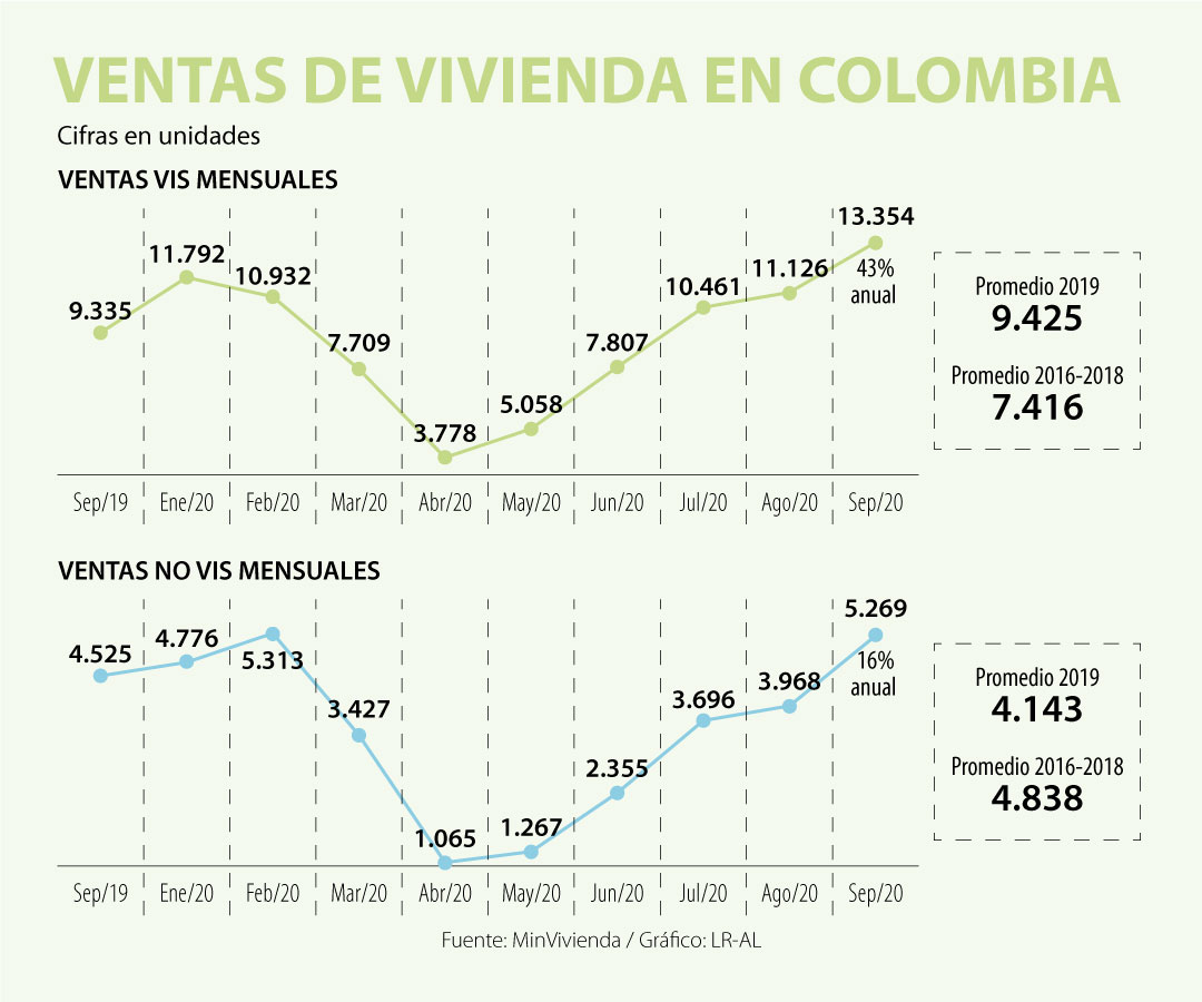 Esto, porque el mes pasado las ventas de Vivienda de Interés Social (VIS) registraron un crecimiento de 43% en comparación a septiembre de 2019, y las ventas de No VIS presentaron un aumento de 16% con respecto al mismo mes del año anterior.