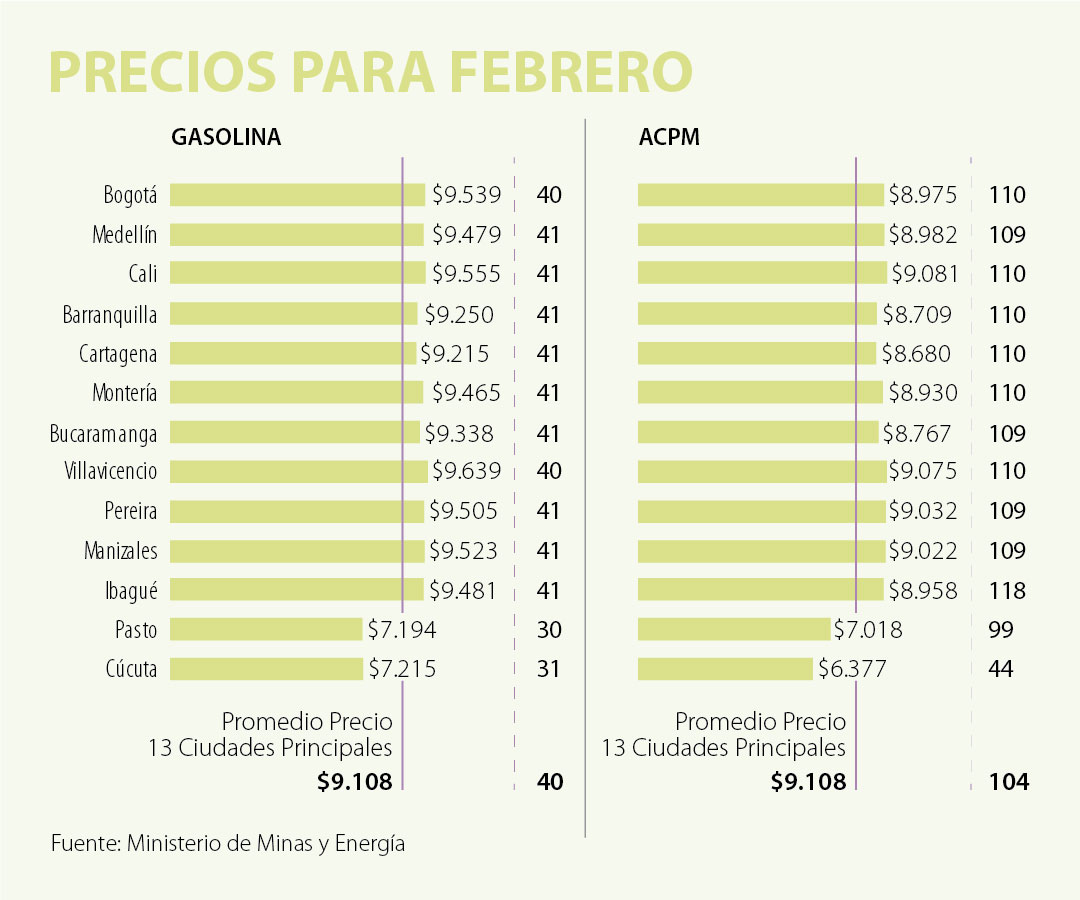 Los conductores que a partir de hoy tanqueen su vehículo tendrán que pagar $40 por el galón de gasolina y hasta $104 por el Acpm. Ayer, el Ministerio de Minas y Energía publicó los nuevos precios de referencia en las 13 principales ciudades del país, cambiando la tendencia a la baja con la que comenzó el año, pues hace un mes el costo promedio bajó alrededor de $60 para la gasolina.