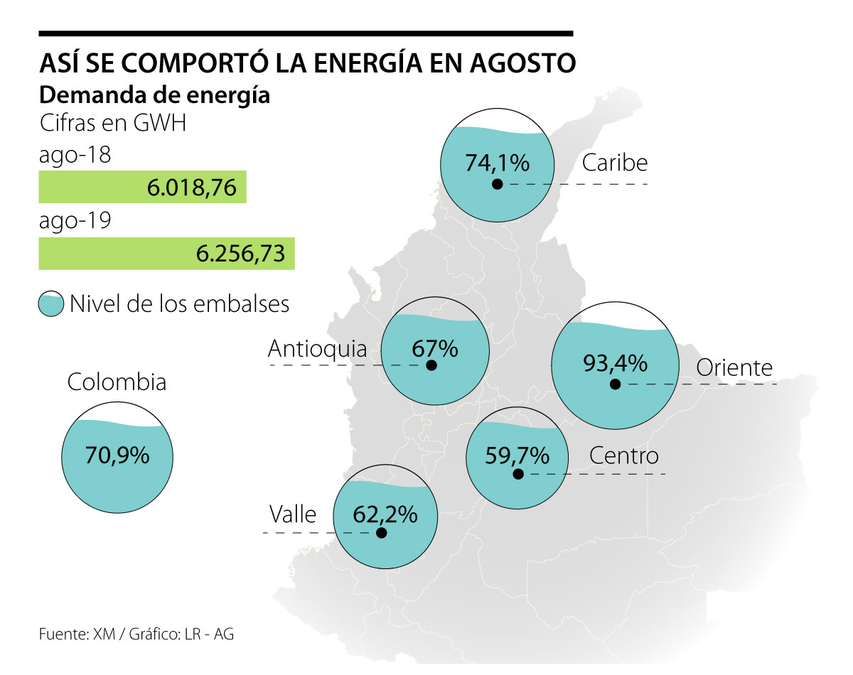 Además, la entidad dio a conocer que el nivel de los embalses de generación de energía eléctrica cerró agosto en 70,9%, lo que representó una caída de cuatro puntos sobre lo que se reportó en julio, cuando el nivel llegó a 74,9%. Según el análisis que realizó la entidad, dirigida por María Nohemí Arboleda, por regiones hidrológicas, los embalses que se encuentran con el volumen más alto se encuentran en el Oriente (74,9%) y el Caribe (74,1%). El resto de las regiones está por debajo de 70%: Antioquia (67%), Valle (62,2%) y el Centro (59,7%).