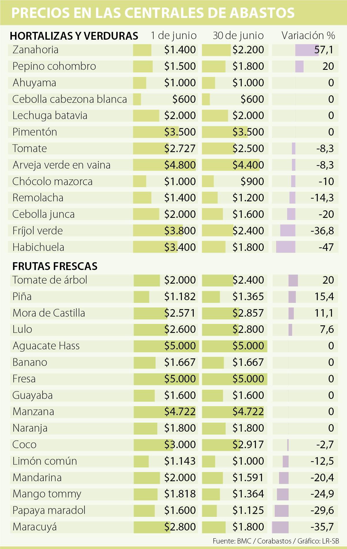 Al tomar una muestra de alimentos representativos de la canasta familiar en junio, fueron pocos los aumentos de precios, aunque las lluvias alteraron el suministro de algunas hortalizas y verduras. En concreto, se registraron incrementos de precios en la zanahoria, el plátano y el tomate de árbol.