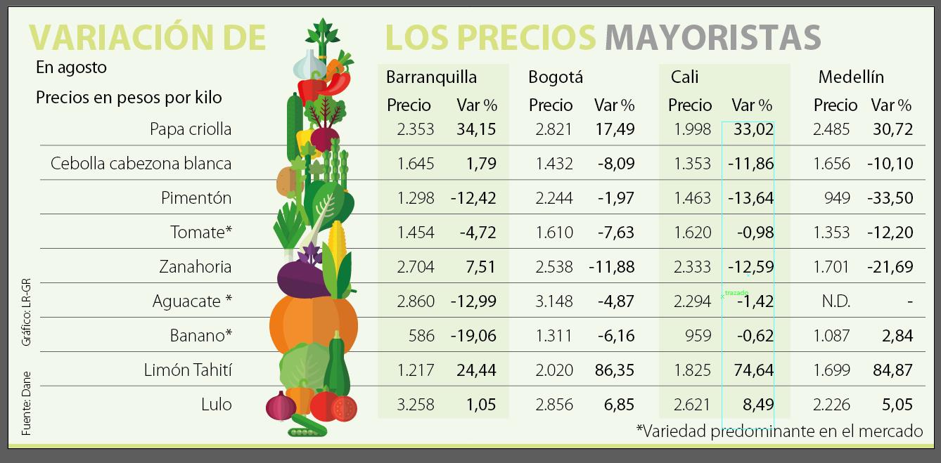 El último reporte del Dane sobre los precios en el Sistema de Información y Abastecimiento del Sector Agropecuario (Sipsa) reveló que para agosto las principales reducciones de precios se registraron en verduras y hortalizas como el pimentón, la arveja verde en vaina, la lechuga batavia, la habichuela o el apio; mientras que frutas como el lulo, el limón tahití, la manzana royal importada, el mango tommy y la piña gold, registraron los mayores aumentos en 60 mercados mayoristas de Colombia.