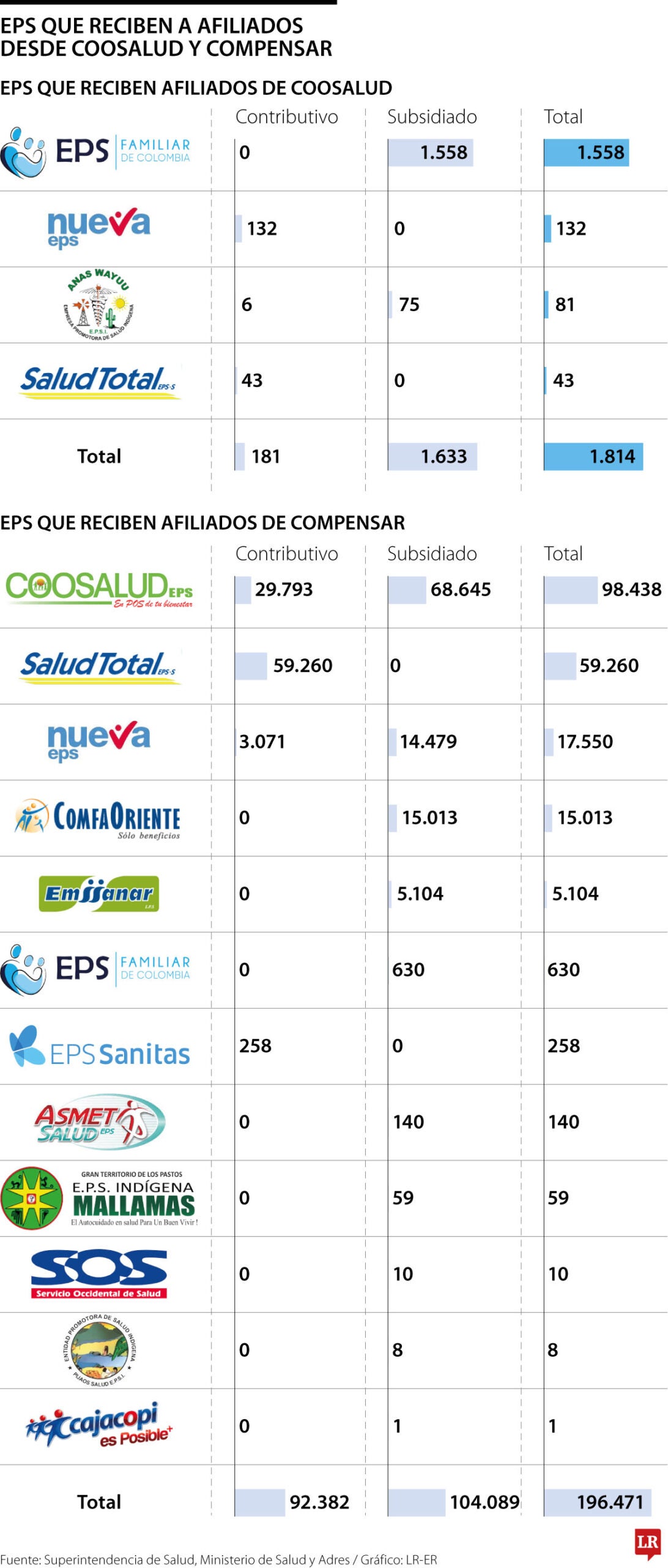 Además, EPS Familiar de Colombia recibió otros 630 usuarios, EPS Sanitas con 258 personas, Asmet Salud con 140 afiliados, Mallamas EPSI con 59, EPS S.O.S. con 10, Pijaos Salud EPSI con 8 y Cajacopi con 1. En total, fueron trasladados 196.471 usuarios en este grupo.