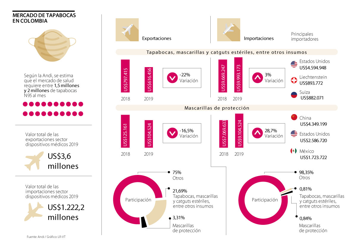 “La línea médica es 100% importada. Estamos analizando el tema, la industria textil en Colombia no está declarada como primera necesidad, y los tapabocas vienen de telas. Aún así, las telas que se usan para la fabrican de estos tapabocas generalmente vienen de China, y se requieren los filtros adecuados”, explicó Escobar.