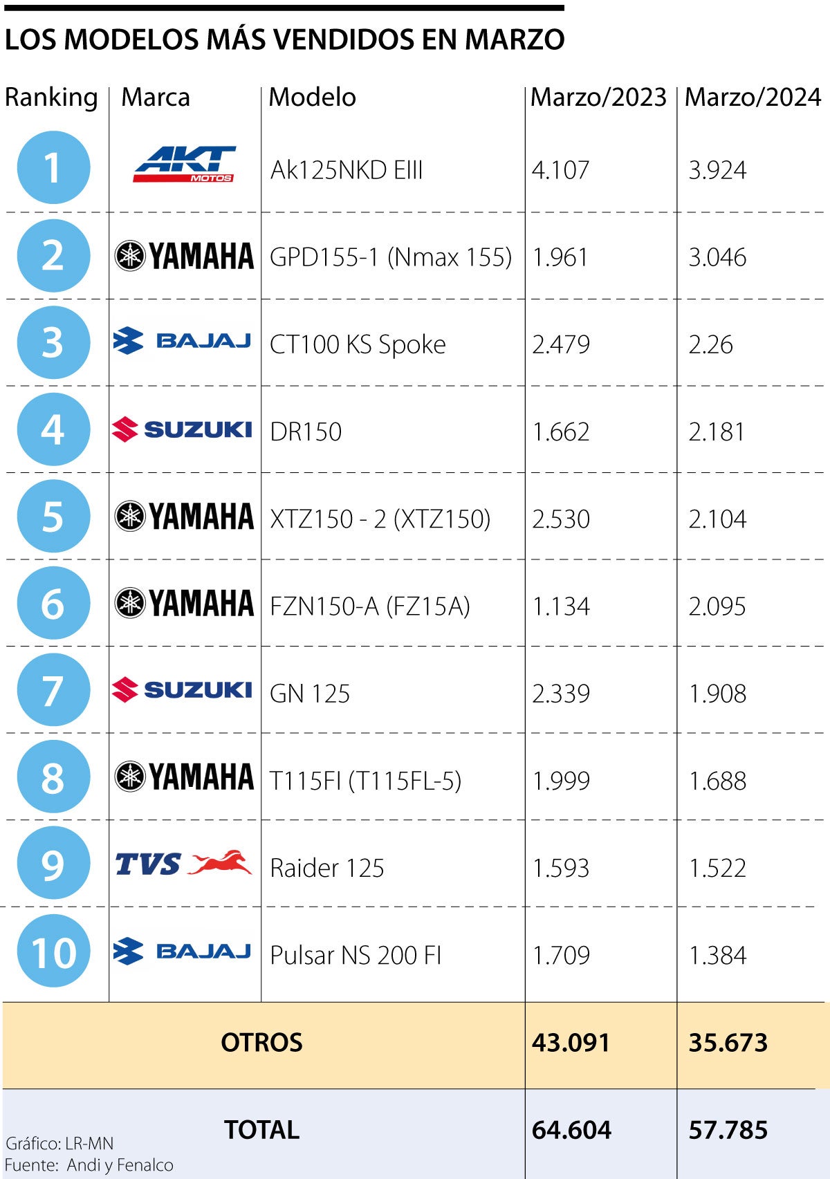 Este segmento de motocicletas es uno de los más competidos y, según las cifras de la Cámara de las Motocicletas de la Andi para marzo, está liderado por Yamaha, con 22% de la participación de mercado; AKT, que cuenta con 16%; y el top 3 lo completan Suzuki y Bajaj, ambas con 15% del total.