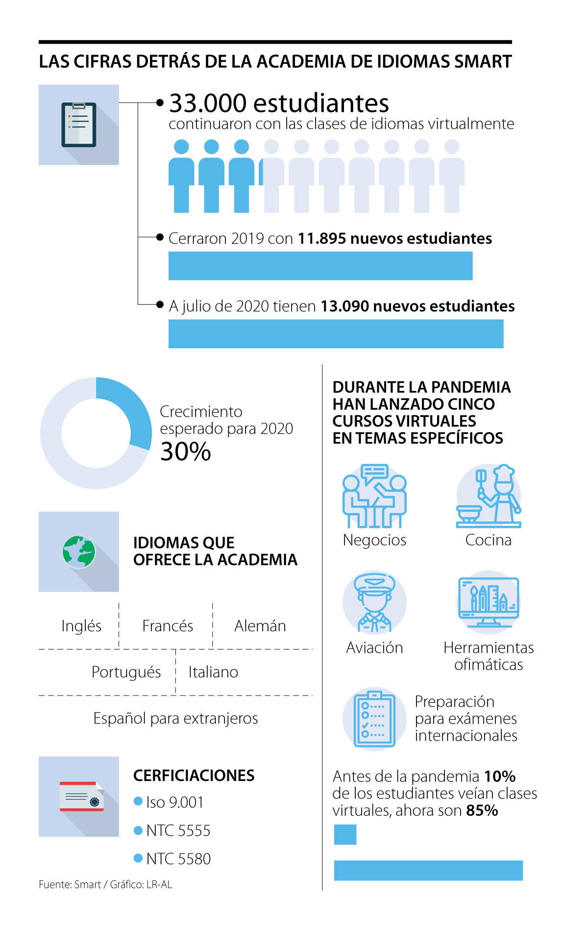 A pesar de la crisis financiera que están viviendo muchas compañías por la pandemia, no se detienen los planes de expansión de muchas otras, como el de la Academia de idiomas Smart, que a finales de año plantea abrir seis nuevas sedes, cuatro para Cundinamarca y dos para la regional Antioquia, según aseguró Sandra Castellanos, directora de C.P de la compañía.