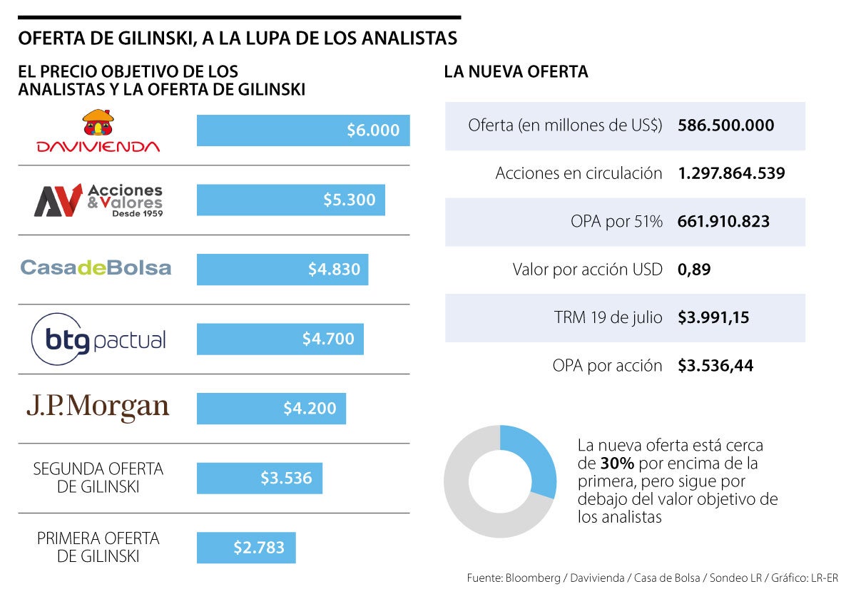 Según el analista Gregorio Gandini, fundador de Gandini Análisis, las acciones de la cadena de supermercados transan a $4.030 con una TRM de $3.995, lo que equivale a US$1,03. “Consideramos que el precio ofrecido por Gilinski está muy por debajo del precio justo, aún más teniendo en cuenta que quiere el control de la compañía (51%), lo cual debería incluir una prima de control, que normalmente está entre 20% y 30% por encima del precio de mercado, lo cual equivaldría a un precio de $5.000-$5.400”, agregaron desde Casa de Bolsa.