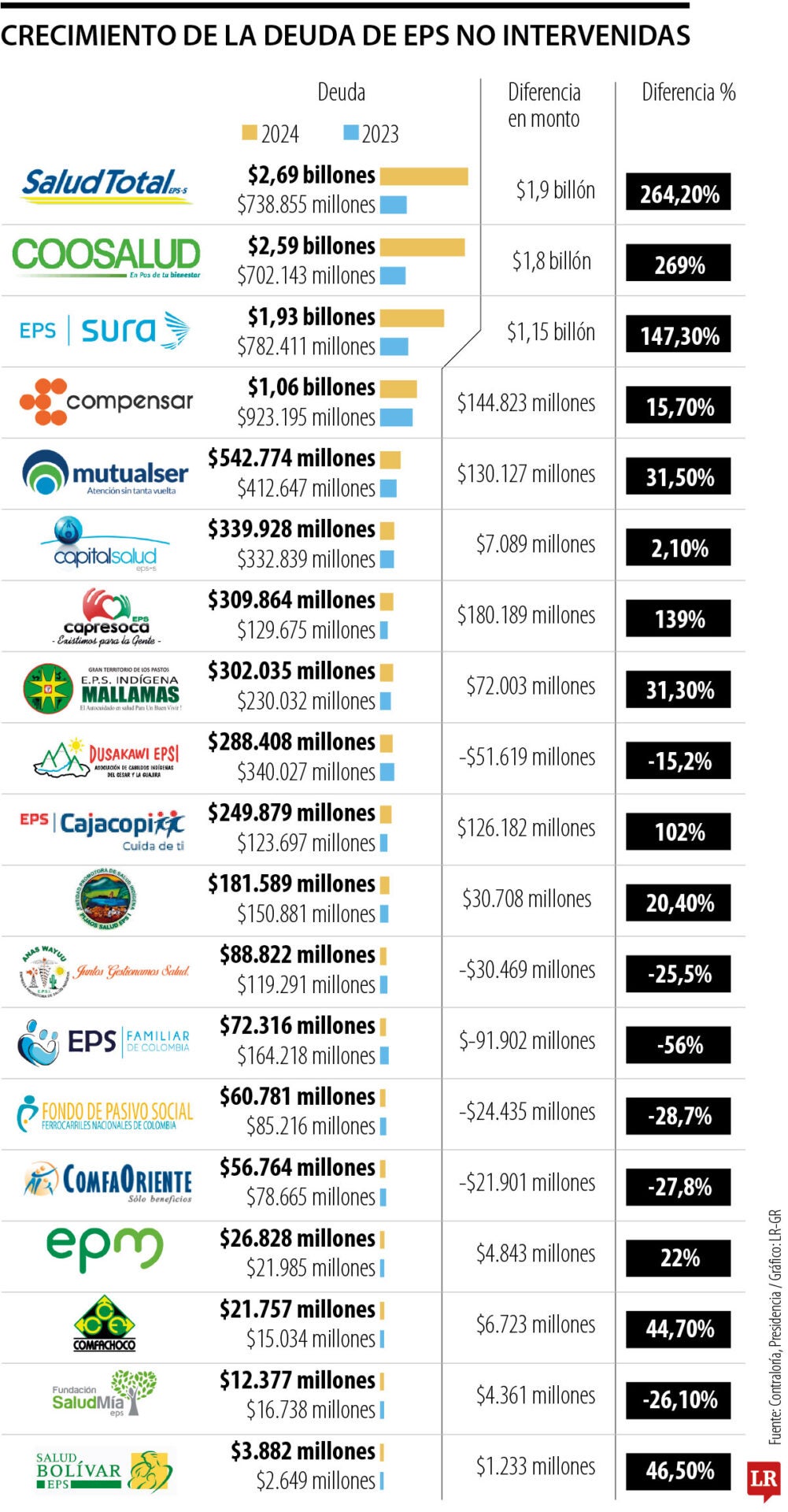 En cuanto a las no intervenidas, su deuda en 2024 llegó a $10,8 billones, mientras que en 2023 se ubicaba en $5,3 billones, $5,47 billones de diferencia, aumentó 101,9%. En específico, Coosalud (269%), Salud Total (264%) y Sura (147%) fueron las que más aumentaron su deuda. Mientras que hubo disminución por parte de: Familiar de Colombia (56%), Ferrocarriles Nacionales (28,7%), Comfaoriente (27,8%), Salud Mía (26,1%), Anas Wayuu (25,5%) y Dusakawi (15,2%).