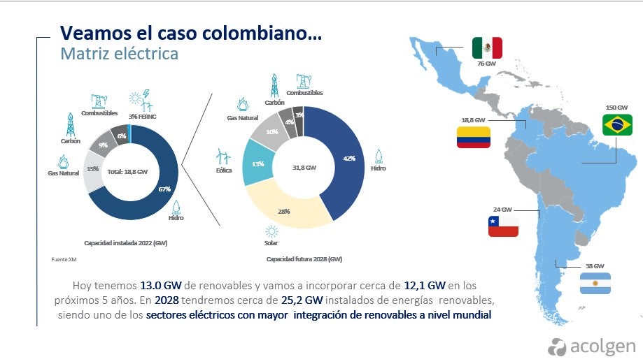 Sobre la matriz energética, la líder gremial afirmó que el país cuenta ya con una matriz limpia. Colombia, según Acolgen, es un caso de éxito de diseño de mercado a nivel internacional y "no podemos partir de la base de que es un modelo fallido". "Las tarifas de energía son una dificultad, pero es un reto no solo para Colombia, sino para el resto del mundo. El diseño de mercado es exitoso acá y ha permitido que no haya apagones y que, la mayor parte del tiempo, se den precios eficientes", agregó.