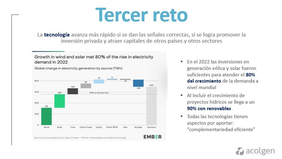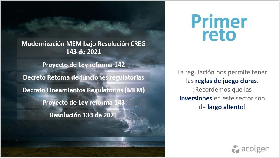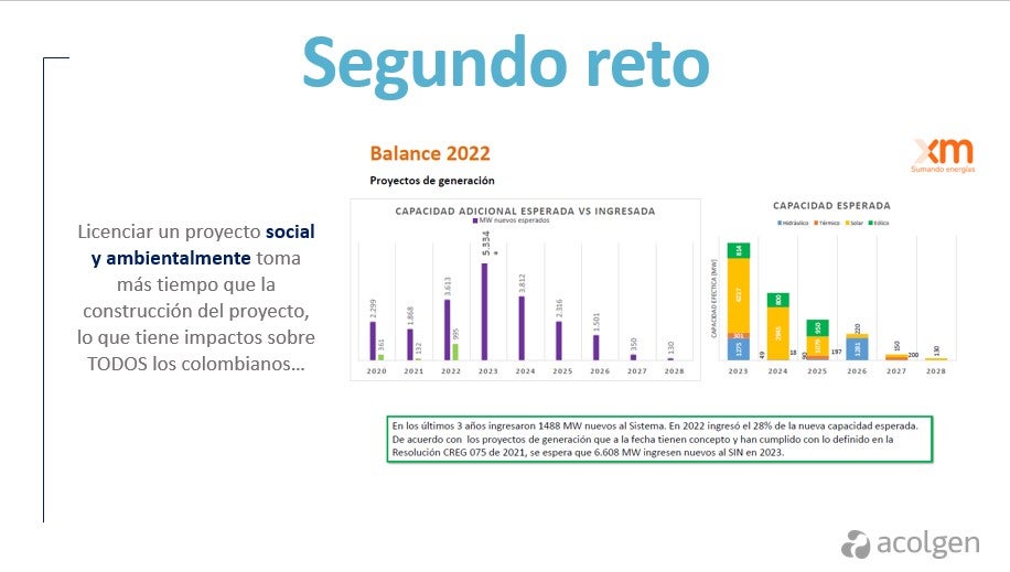 Entre los retos encontrados por las empresas generadoras está una expectativa no cumplida de energía que debe entrar a la matriz y no ha logrado su incorporación. Acolgen también hizo un llamado en materia de licencias. "Hay que dar señales para que la transición energética se dé. Tenemos serias dificultades con las licencias ambientales", dijo. Incluso en un cambio legislativo, las consultas previas podrían demorar hasta 100 días, lo cual sería un atraso significativo de los proyectos de generación.