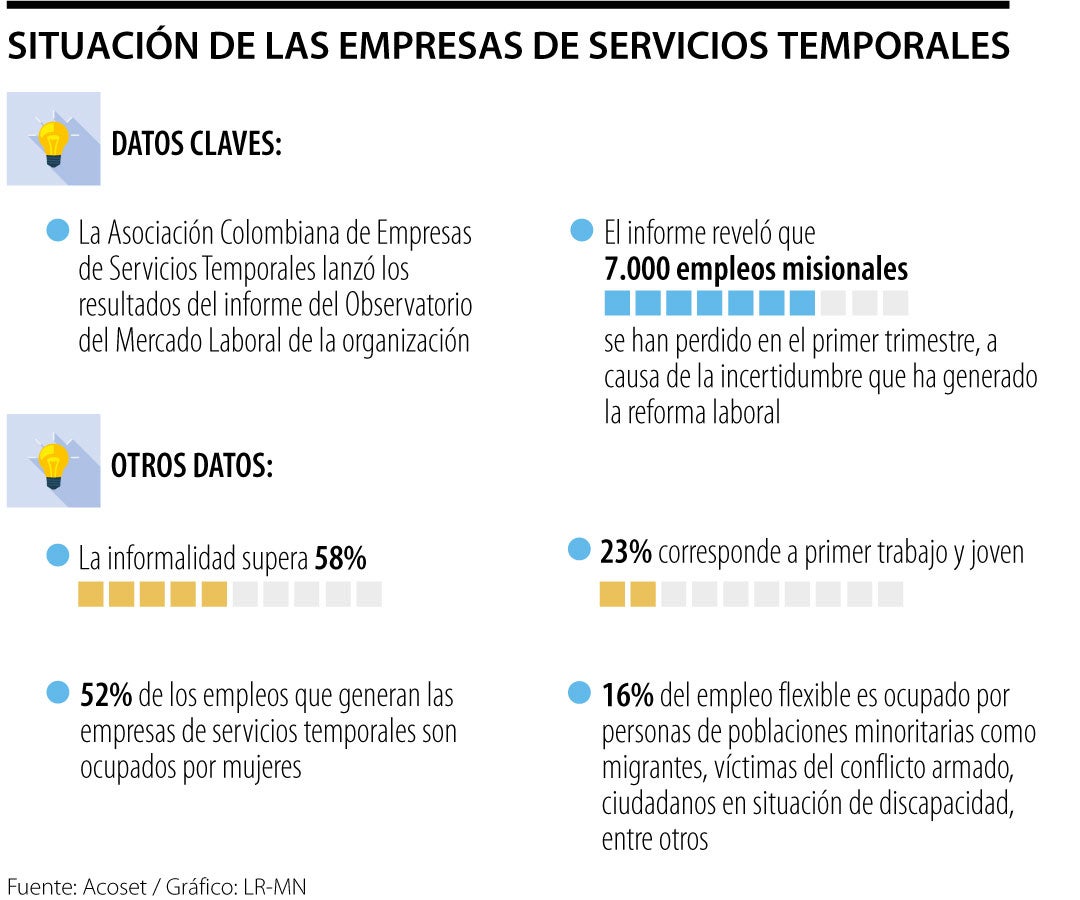 La Asociación Colombiana de Empresas de Servicios Temporales, Acoset, lanzó los resultados del informe del Observatorio del Mercado Laboral de la organización y resaltó que 7.000 empleos misionales se han perdido en el primer trimestre, a causa de la incertidumbre que ha generado la reforma laboral que impulsa el Gobierno del presidente Gustavo Petro y que afectaría directamente al sector.