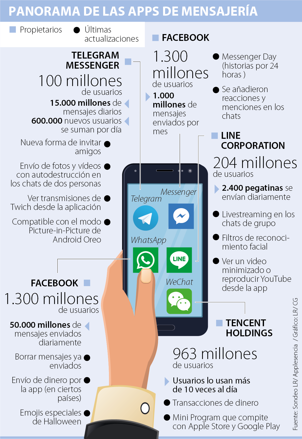 Dentro de la lista de las aplicaciones más populares en el servicio de mensajería instantánea también se encuentran aplicaciones como Line que ya tiene 214 millones de usuarios activos en el mundo que envían 2.400 pegatinas diariamente, y que en su actualización ofrece livestreaming en los chats de grupo y filtros de reconocimiento fácil. WeChat, que es el servicio que le pisa los talones a WhatsApp, también ofrece la posibilidad de conectar la app con la cuenta bancaria y hace transacciones.