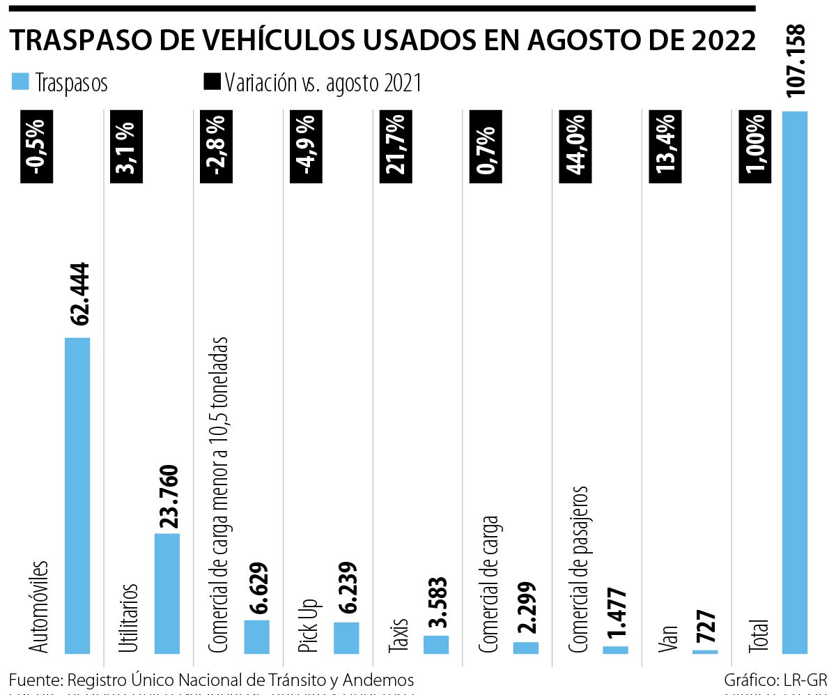 En agosto, los automóviles registraron 62.444 traspasos (-0,5%), seguido de los utilitarios con 23.760 unidades (3,1 %), comercial de carga menor a 10,5 toneladas con 6.629 vehículos (-2,8 %), Pick Up con 6.239 (-4,9 %) y taxis con 3.583 unidades (21,7%).