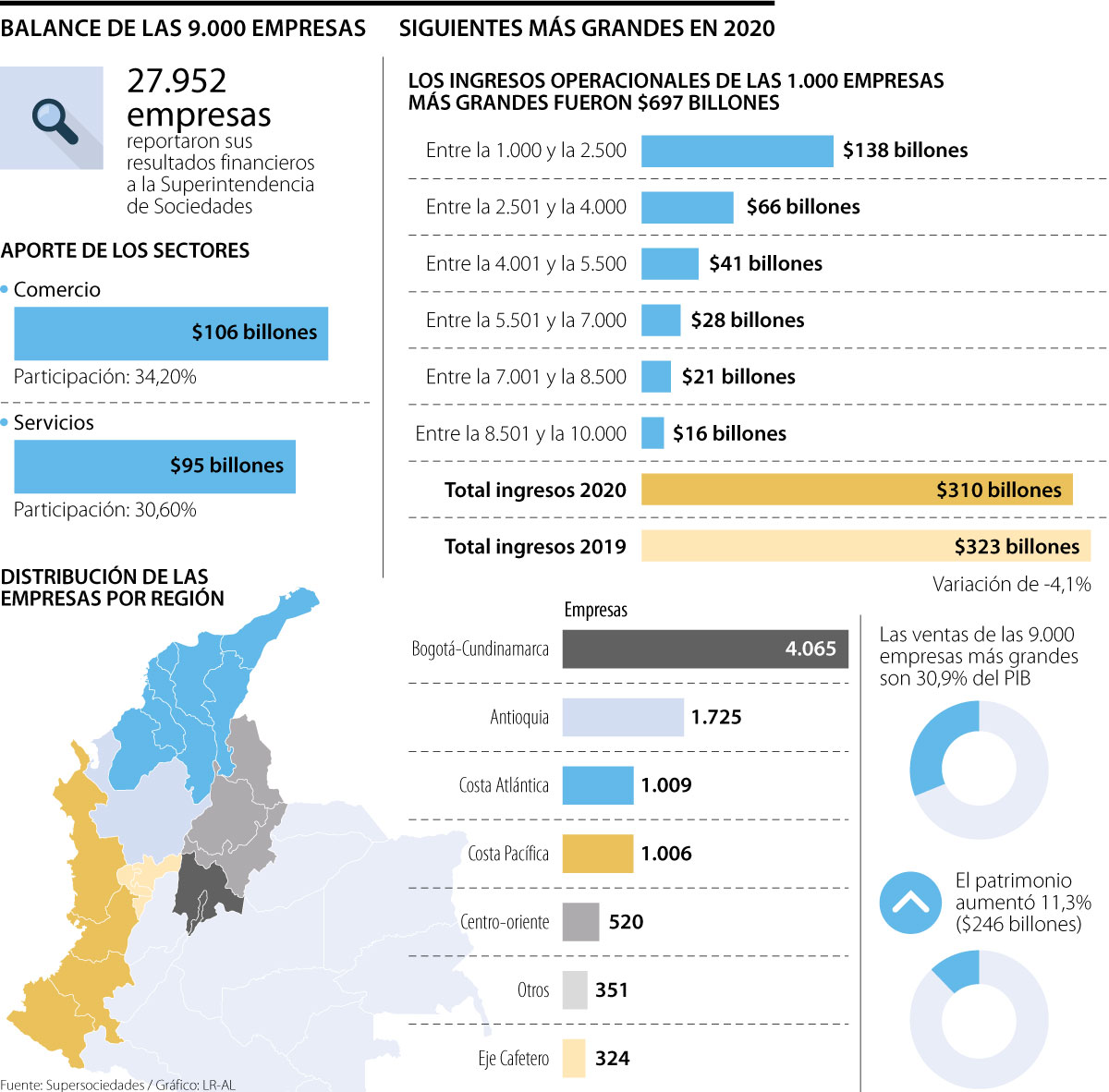 Para complementar la información relevante sobre el sector empresarial y su participación el año pasado con la llegada de la pandemia, la Superintendencia de Sociedades dio a conocer el informe de las 9.000 empresas más grandes después de las 1.000 ya reportadas, teniendo en cuenta los datos de 27.952 sociedades.