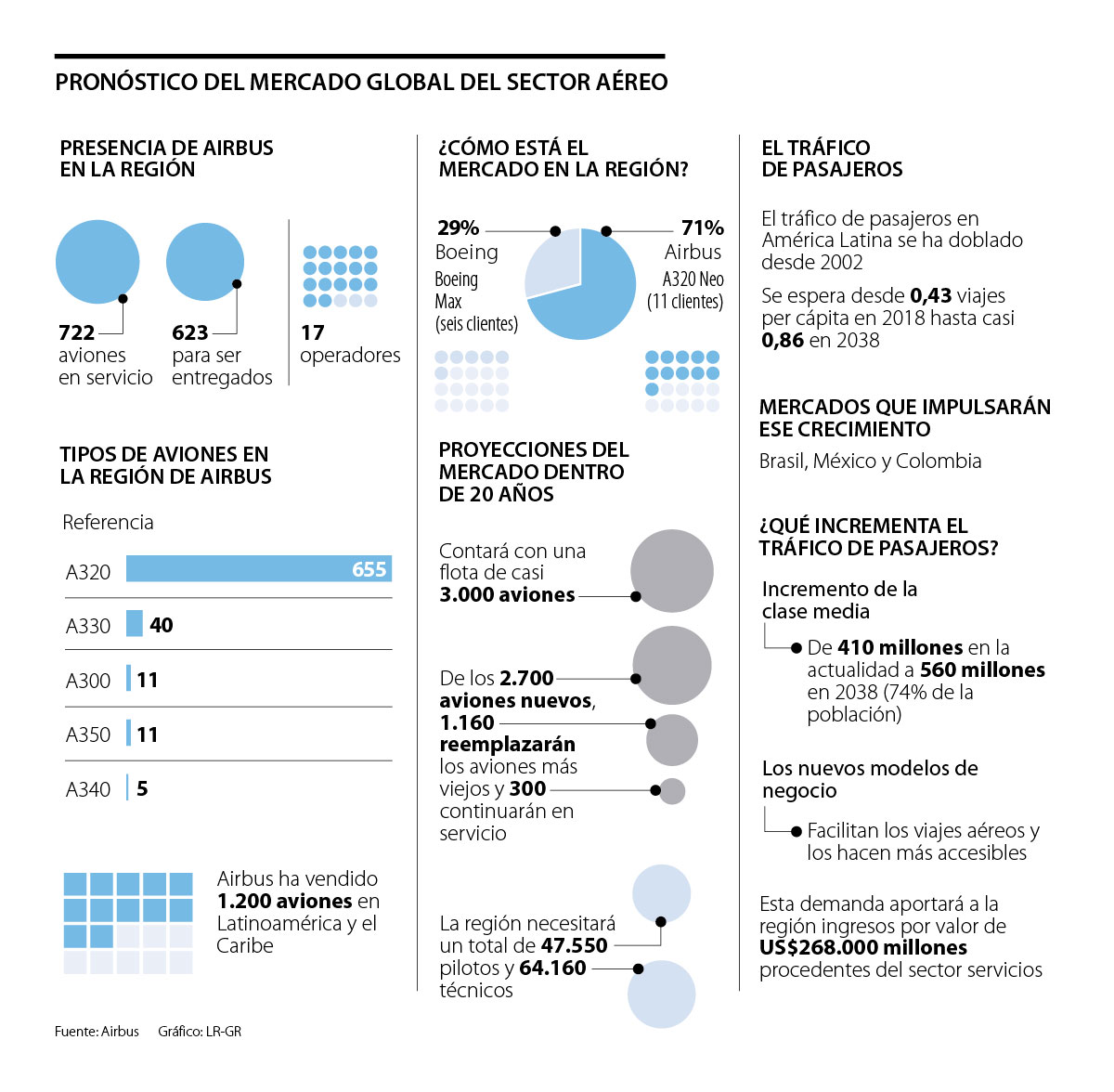 Dicho logro de la compañía está respaldado en que Airbus ha vendido 1.200 aviones en Latinoamérica y el Caribe. Actualmente, tiene una cartera de pedidos más de 600 aeronaves y más de 700 están en servicio, es decir que 60% de la flota que está operando en la región ha sido producida por esta empresa, explicó Arturo Barreira, presidente de la firma para América Latina y el Caribe.