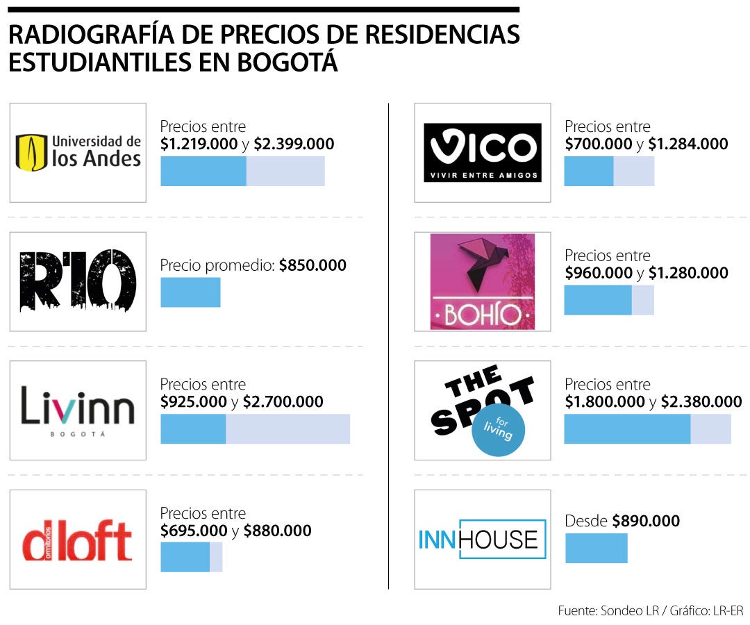 De acuerdo con un sondeo LR, un estudiante paga en promedio $1.290.000 por el alquiler de una residencia estudiantil, que a diferencia de una casa normal, incluye una serie de servicios integrales, diseñados a la medida de lo que necesita un joven recién salido de la casa de sus padres. En este precio está incluido el mobiliario del apartamento, junto con los servicios básicos de agua, energía, internet y hasta lavandería, en los planes más básicos.