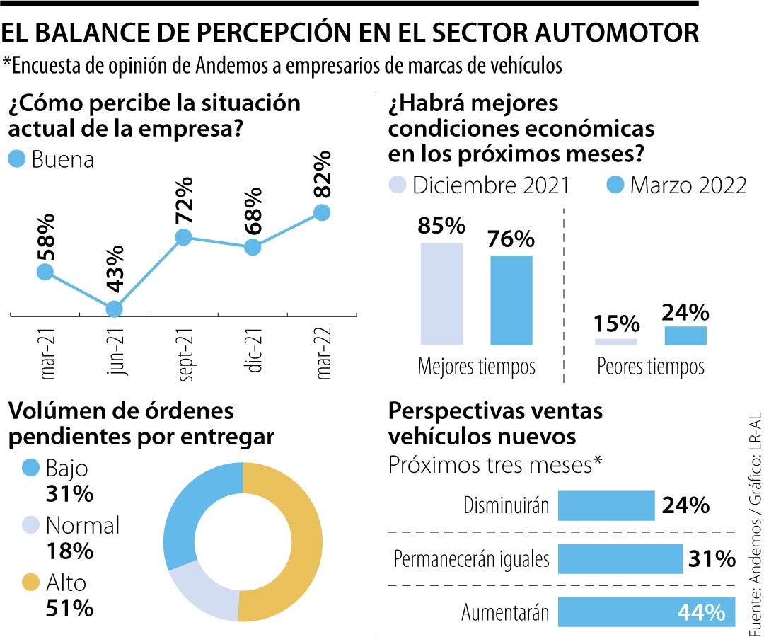 Según resultados de la encuesta de los empresarios del sector automotor preparada por Andemos en el mes marzo, 82% de los empresarios opinaron que la situación de la empresa es buena, otro 76% pronosticó que dentro de un año habrá mejores condiciones económicas en el país y 65% dijo que dentro de un año al negocio le estará yendo mejor o igual.