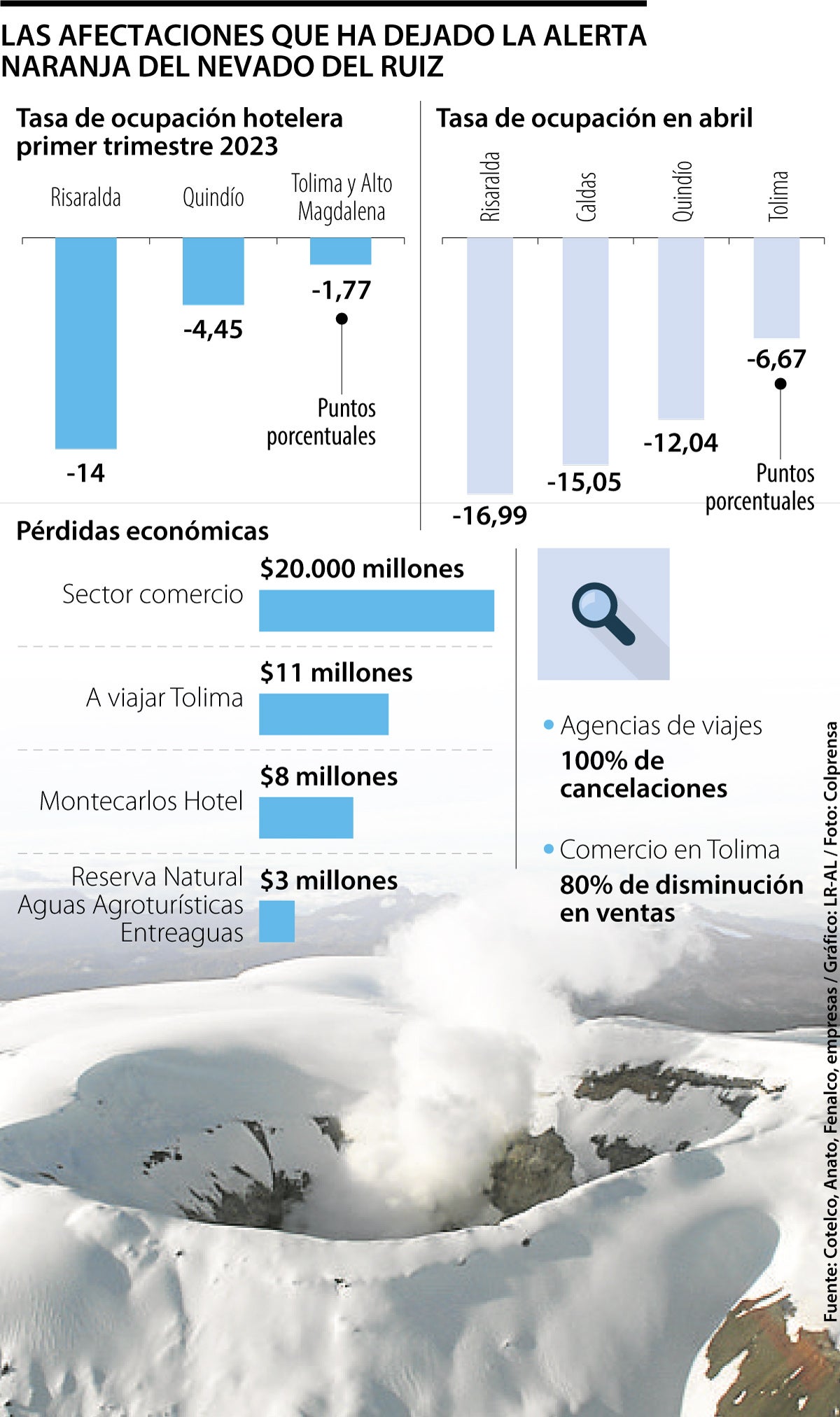 “En 13 departamentos del país se reportaron pérdidas económicas respecto a la primera semana de abril de 2022, algunos de ellos han superado 40% como San Andrés y Providencia, Cauca, Caldas, Tolima y Cesar.Estas pérdidas hacen referencia al total de establecimientos y alojamientos que se reportan en el Registro Nacional de Turismo (RNT) y que suman un valor aproximado de $136.000 millones debido, principalmente, al aumento en el IVA, las alzas en los tiquetes aéreos y los cierres por la alerta de erupción del volcán Nevado del Ruiz”, detalla José Andrés Duarte, presidente de Cotelco.