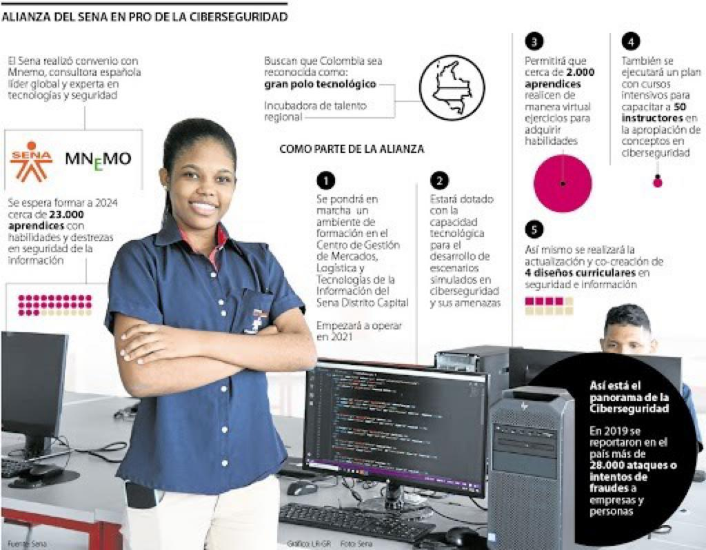 Por ello, con el fin de suplir las necesidades del sector productivo y contribuir a la empleabilidad de los colombianos, el Sena realizó un convenio con Mnemo, consultora española líder global y experta en Tecnologías y Seguridad, con el objetivo de formar cerca de 23.000 aprendices en ciberseguridad a 2024.