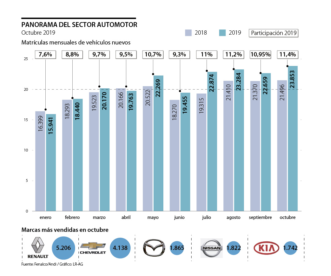 Sobre el detalle de las marcas con mayor número de matrículas acumuladas a octubre siguen en el top cinco Renault, con una participación del 22%, Chevrolet con un 14%, Nissan con 6,4%, Mazda con 6,2% y Kia con un 6%, representando el 54% del total de los vehículos matriculados en 2019.