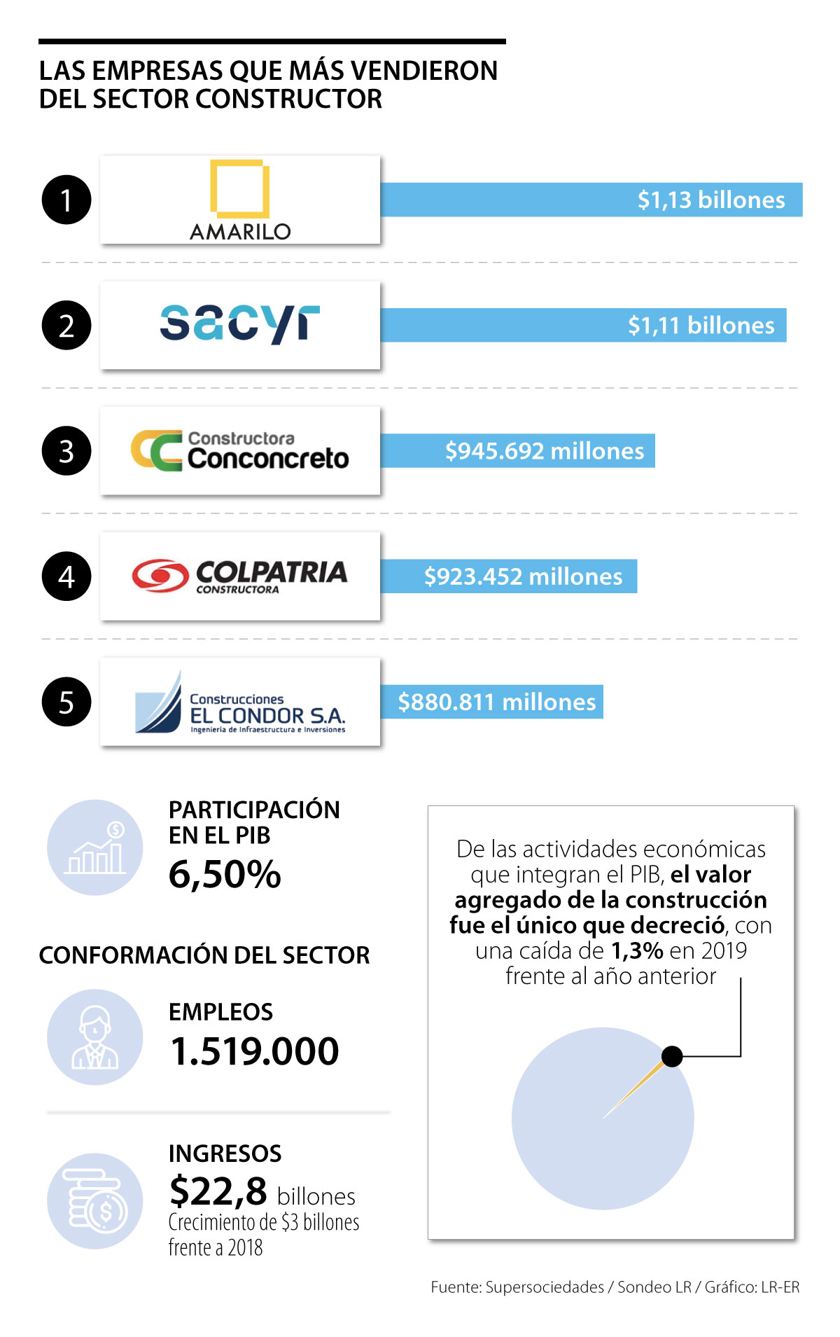 En el segundo lugar de las empresas con más ventas estuvo Sacyr Construcción Colombia, con ingresos de $1,11 billones; en tercer lugar, Constructora Conconcreto con $945.692 millones; en el cuarto lugar, Constructora Colpatria con 923.452 millones; y en el quinto lugar, Construcciones El Cóndor con $880.811 millones.