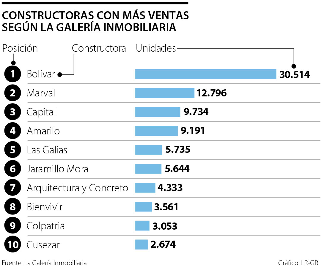 Un informe de La Galería Inmobiliaria, que censa 18 ciudades del país, encontró que en los últimos 12 meses, la constructora que más unidades han vendido es Constructora Bolívar, con un total de 30.514 ventas; es seguida por Marval, con 12.796 viviendas y cierra el top tres Marval con 9.734.