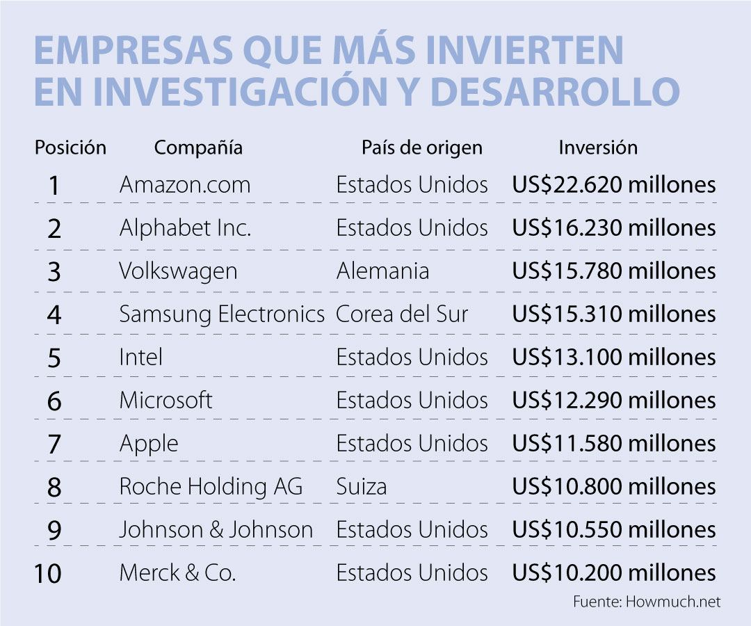 De acuerdo con el informe de PwC, firma de consultoría, en el que se analizaron 1.000 empresas para determinar cuáles fueron las que más invirtieron en investigación y desarrollo el año pasado, el primer lugar se lo llevó nuevamente Amazon con una inversión de US$22.620 millones, 40,6% más que en 2017, cuando también ocupó el primer lugar.