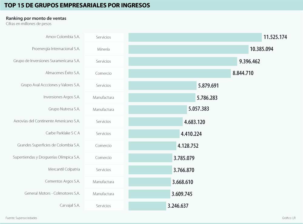 En el reporte se determinó que el total de ingresos, de los 537 grupos que reportaron, fue de $195,4 billones. Los primeros lugares del listado fueron ocupados por Amov, grupo que está compuesto por las filiales locales del mexicano Carlos Slim, y cuyo balance financiero reportó ingresos por $11,5 billones. En segundo lugar está Proenergía Internacional, con $10,3 billones, seguido de Grupo de inversiones Suramericana S.A. con un reporte de $9,3 billones.