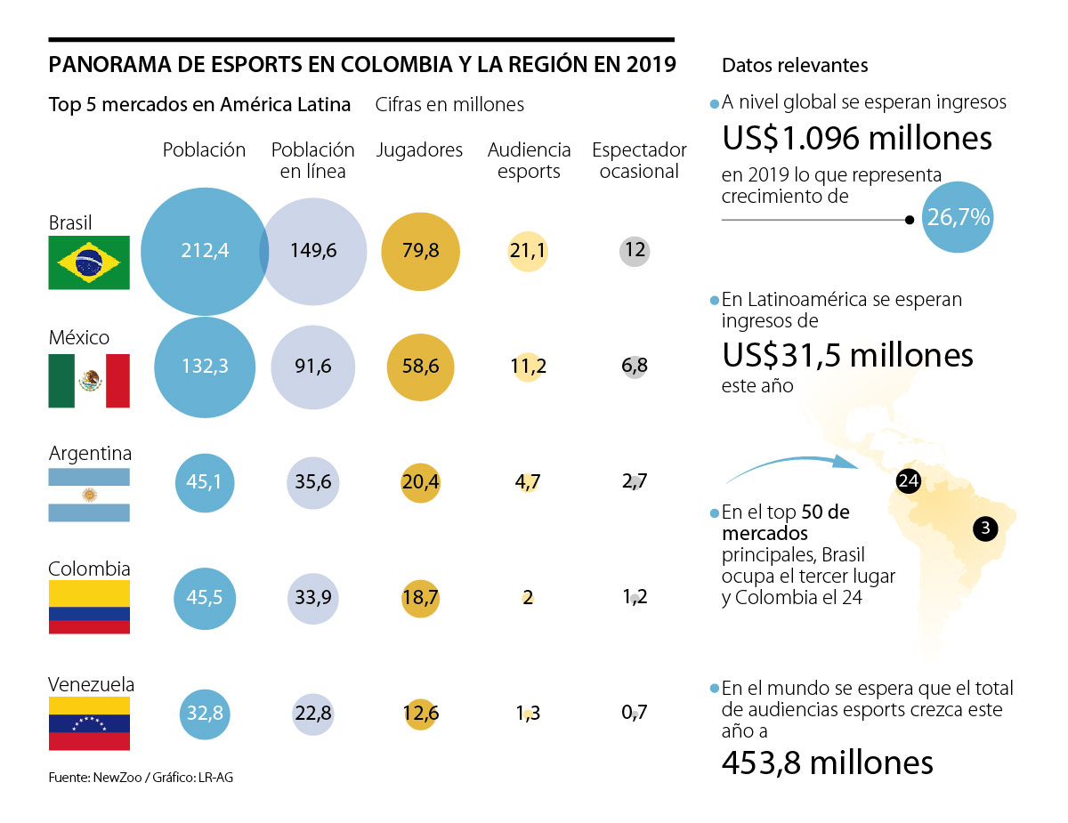 Por su parte, en la región se espera que esta industria mueva US$31,5 millones y tenga una audiencia de 45,5 millones. De esa cifra, Colombia abarca 4,4% al contar con un total de espectadores que llega a dos millones de personas, ocupando el cuarto lugar de la región, luego de Brasil, México y Argentina.
