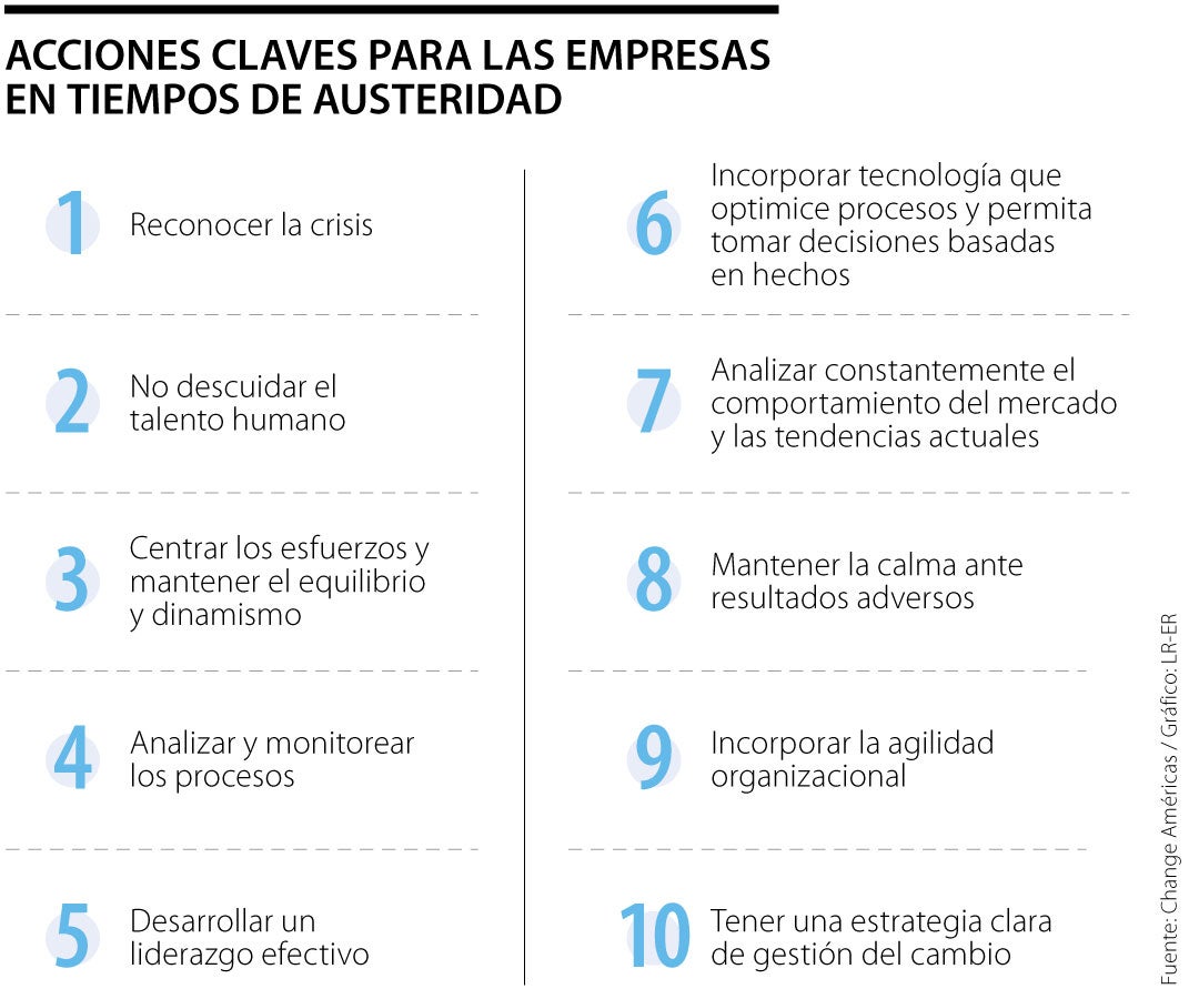 Ante la desaceleración económica prevista para este año, Change Américas sugiere algunas acciones clave como analizar y monitorear los procesos, desarrollar un liderazgo efectivo, Incorporar tecnología que optimice procesos y permita tomar decisiones basadas en hechos, analizar constantemente el comportamiento del mercado y las tendencias actuales, incorporar la agilidad organizacional y tener una estrategia clara de gestión del cambio.