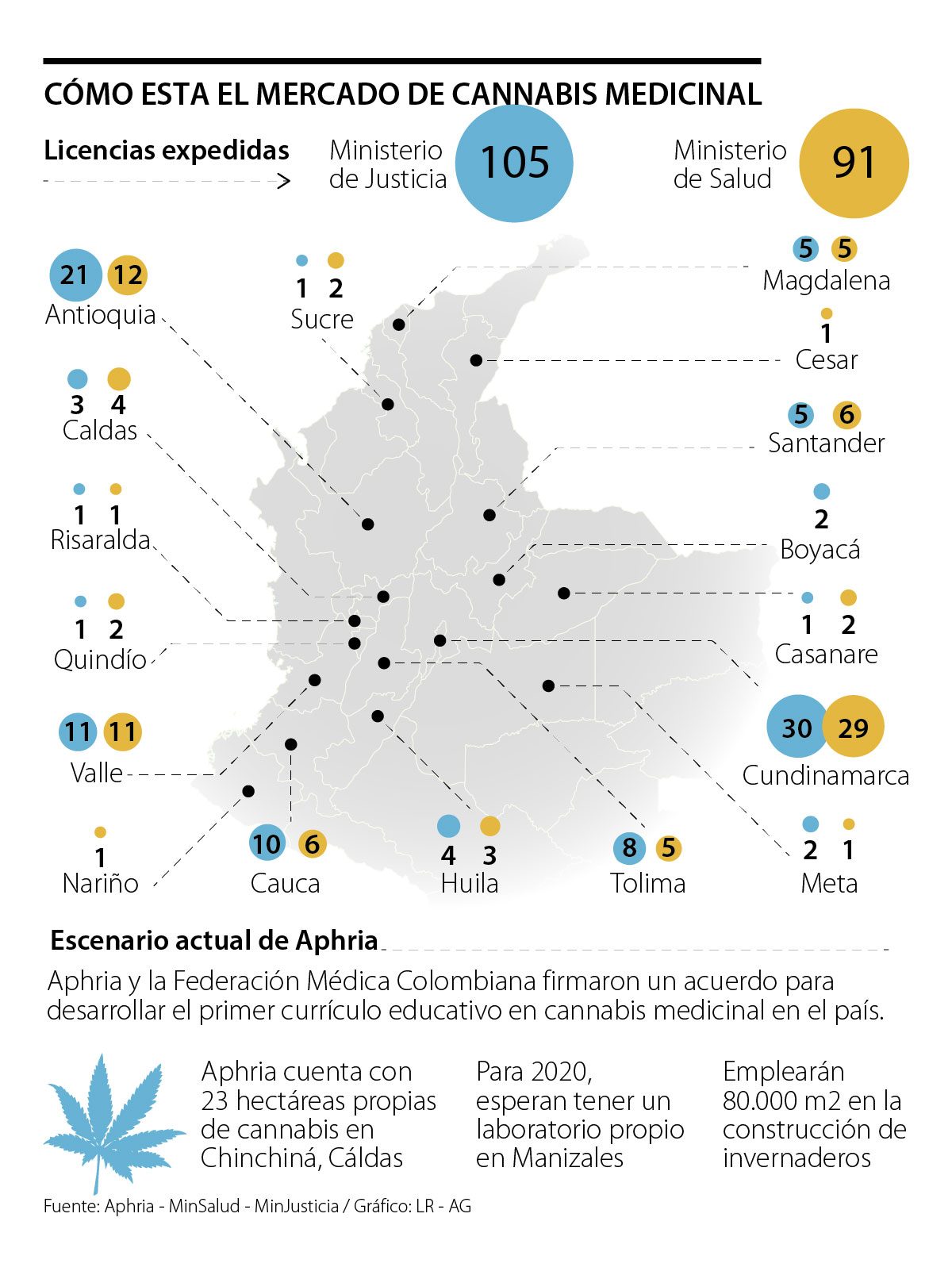 Cundinamarca es el departamento que lidera el tema con 59 licencias entregadas entre Justicia y Salud. Le sigue Antioquia con 33, Valle con 22, Cauca con 16 y Tolima con 13.