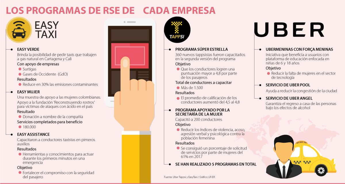 A pesar de las disputas legales que haya por resolver, Uber, EasyTaxi y Tappsi son cuatro de las aplicaciones referentes a transporte que más se utilizan en Colombia. LR conoció los proyectos que cada una de estas plataformas realizan en cuestión de responsabilidad social para ayudar a sus conductores, pasajeros, y, en ocasiones, a construir ciudades sostenibles por medio de sus servicios.