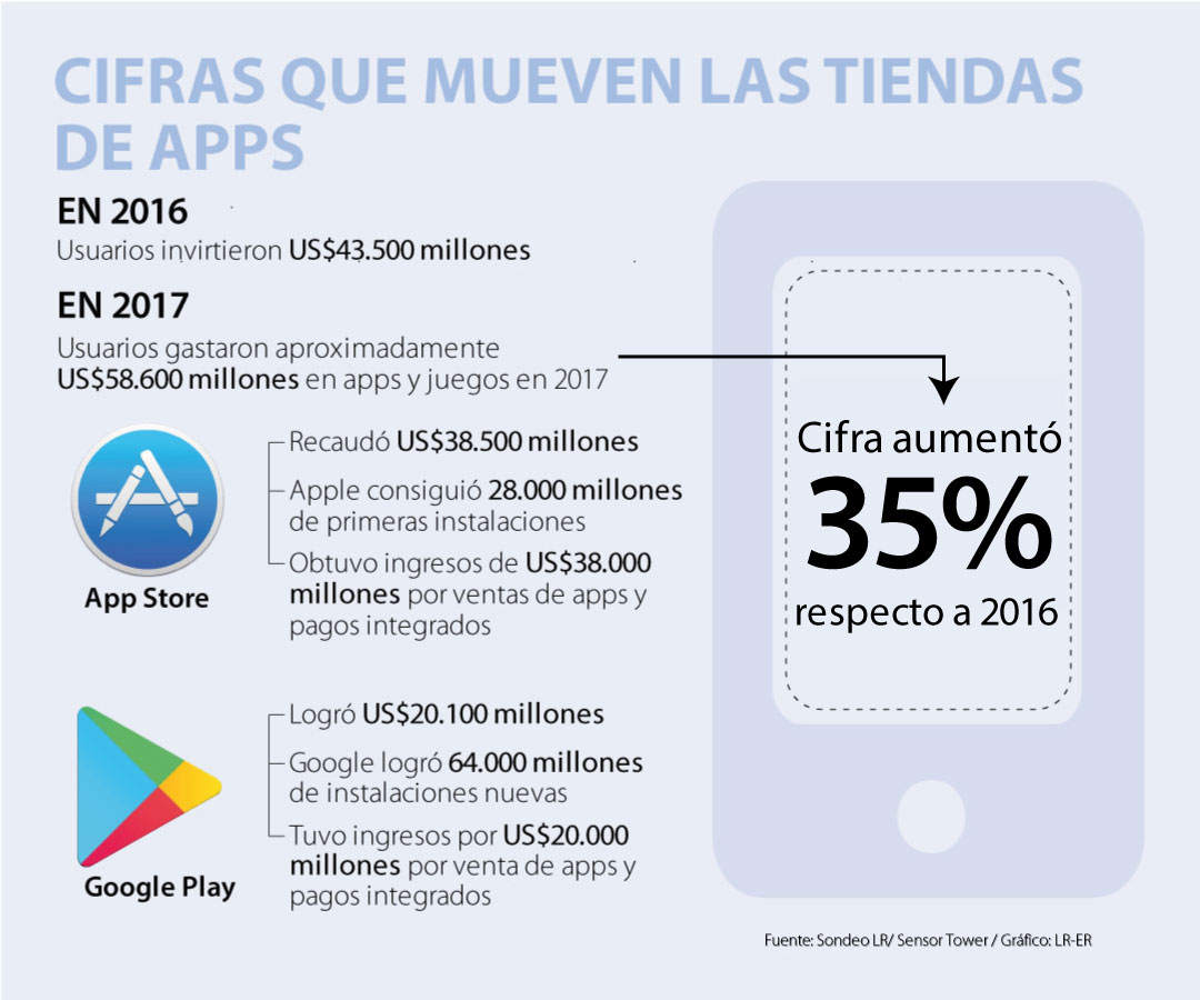 Según el último informe de Sensor Tower, en 2017 los usuarios en el mundo gastaron más de US$58.600 millones en apps y juegos en App Store y Google Play