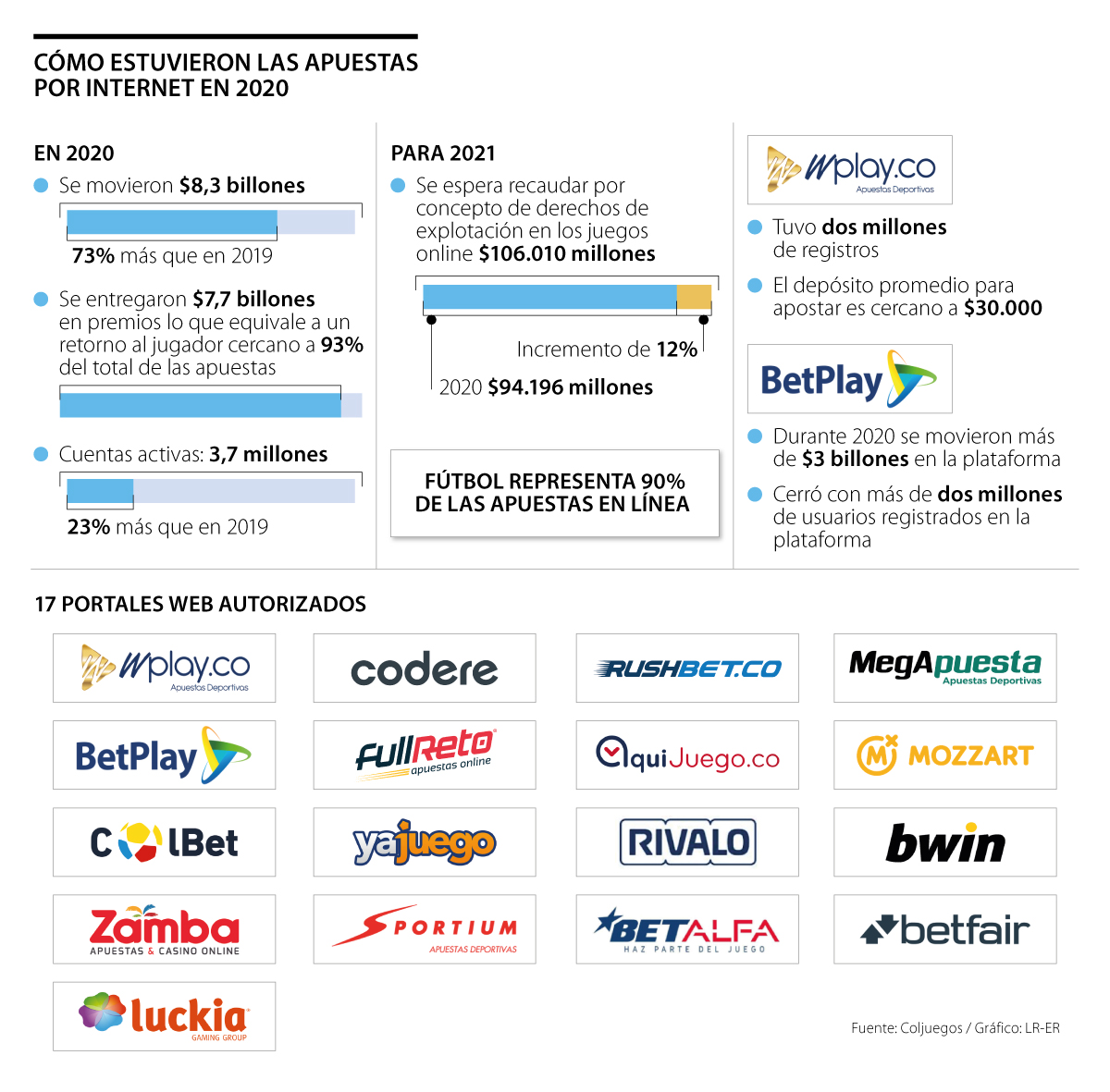 Con corte al 31 de diciembre de 2020, el número de cuentas activas fue de 3,7 millones, un crecimiento de 23% frente a 2019. El año pasado se entregaron $7,7 billones en premios, que equivale a un retorno al jugador cercano a 93%o del total de las apuestas y para 2021 se espera recaudar por concepto de derechos de explotación en los juegos online $106.010 millones, es decir, un incremento de 12% respecto al recaudo obtenido durante el año pasado.