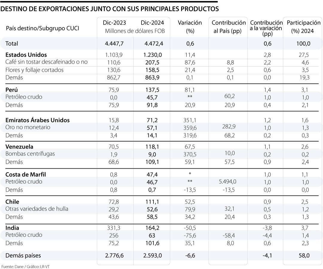 Con base en cifras del Dane, EE.UU. es el primer mercado de productos agrícolas, alcanzando en diciembre de 2024 cifras de US$1.230 millones