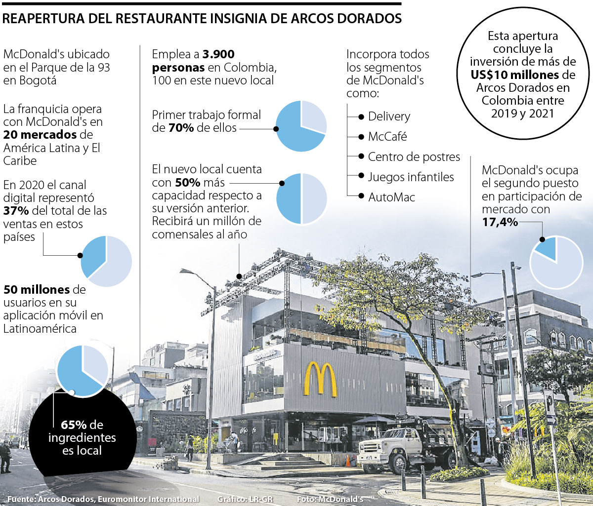 “Este es un restaurante insignia para nuestra compañía y un referente de cómo, a través de la Receta del Futuro de la empresa, queremos hacer parte de la solución de los retos más urgentes de nuestra sociedad. Nos enorgullece entregarle este regalo a Bogotá, así como la posibilidad de emplear a 100 jóvenes residentes de la capital colombiana”, indicó Woods Staton, chairman ejecutivo de Arcos Dorados.