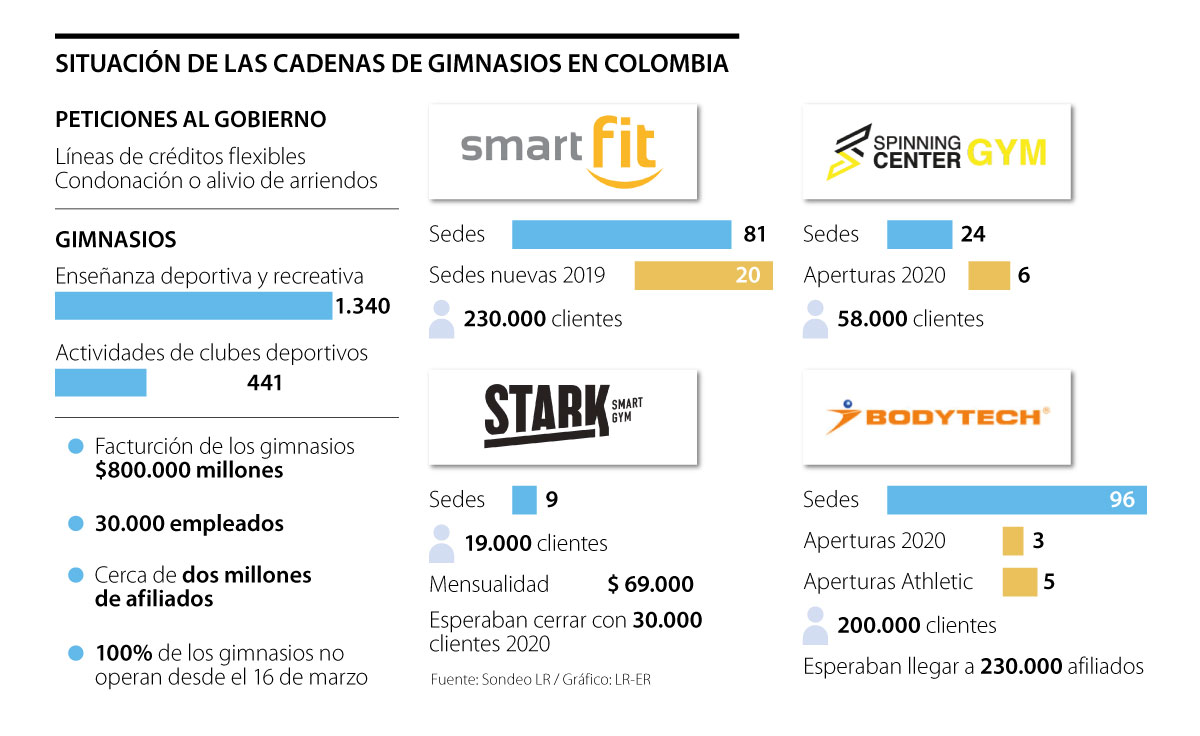 Casallas expresó a este medio que el alquiler de grandes superficies (1.500 metros cuadrados) representa hasta 40% de los costos de los gimnasios. Además, indicó que las cadenas grandes “podemos aguantar dos meses, pero no más”. Señaló que “podemos pagar marzo, pero ya abril y mayo empiezan a ser muy inciertos y no tenemos la capacidad para mantener el staff sino recibimos ayuda inmediata”.