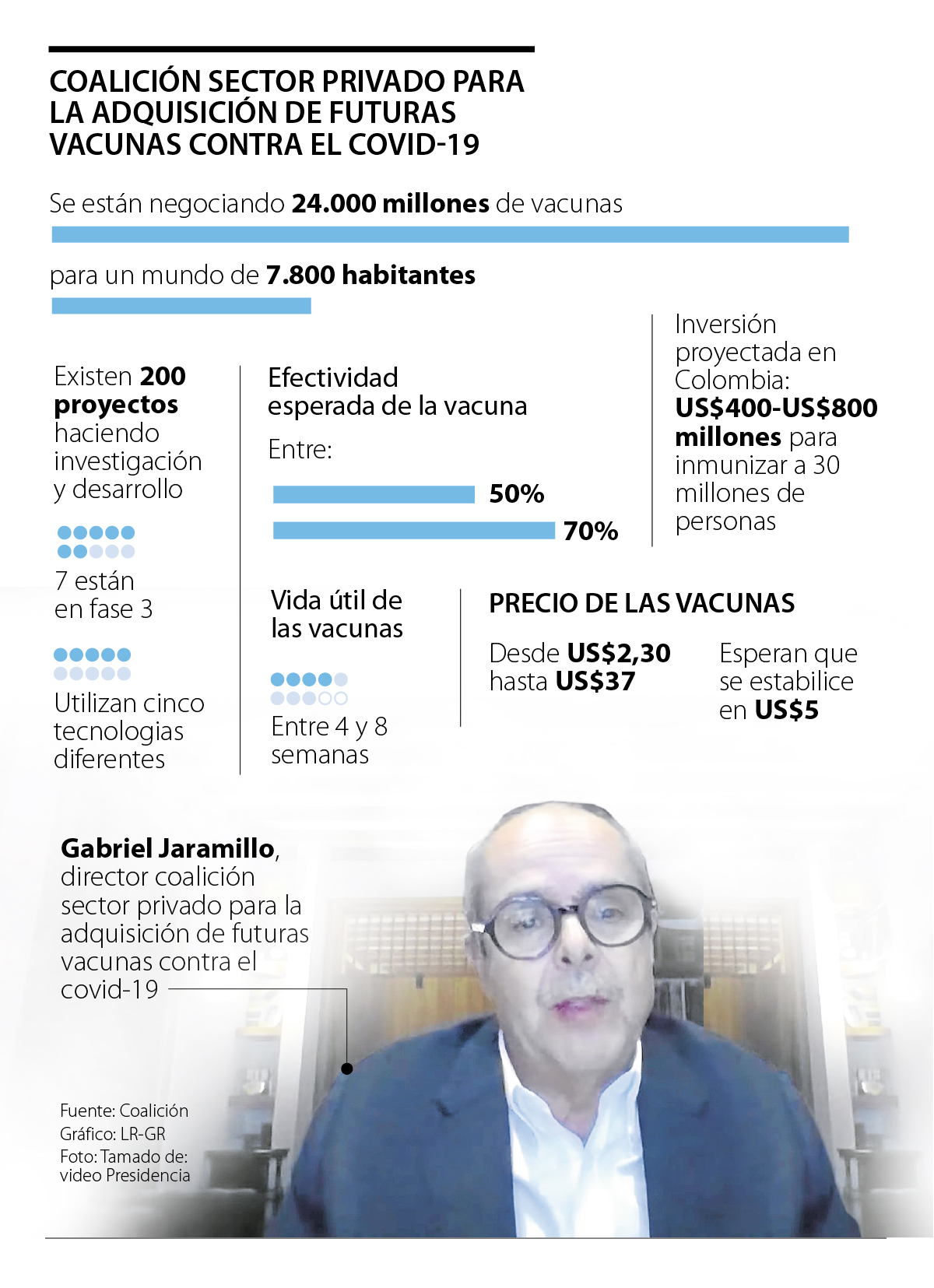 Jaramillo explicó que están llevando a cabo la creación de una fundación sin ánimo de lucro para trabajar la adquisición de la vacuna. Esta fundación, a a su vez, va a abrir un fideicomiso en el cual las empresas van a poder aportar y todo eso va a estar envuelto de un convenio marco con el Ministerio de Salud.