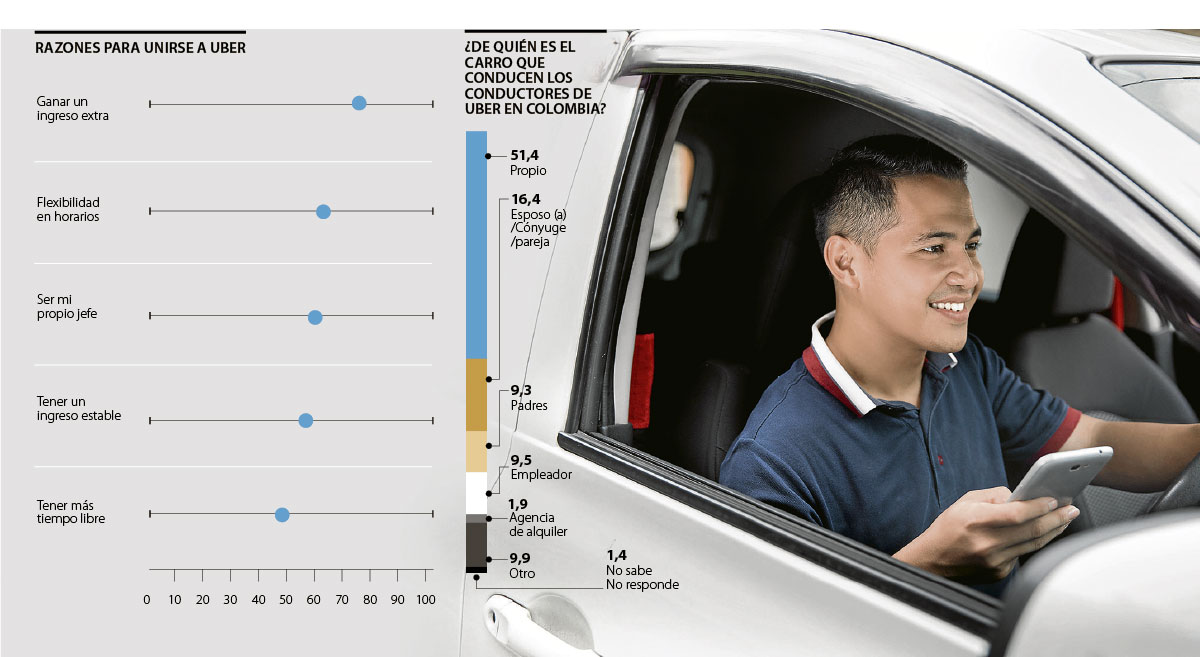 Aunque el estudio publicado no suministra los datos particulares de la encuesta para Colombia en estas afirmaciones, dice que -en la región-, por ejemplo, “entre el 60 % y el 75 % de los conductores con experiencia en la industria del taxi dijeron sentirse orgullosos de trabajar con Uber”.