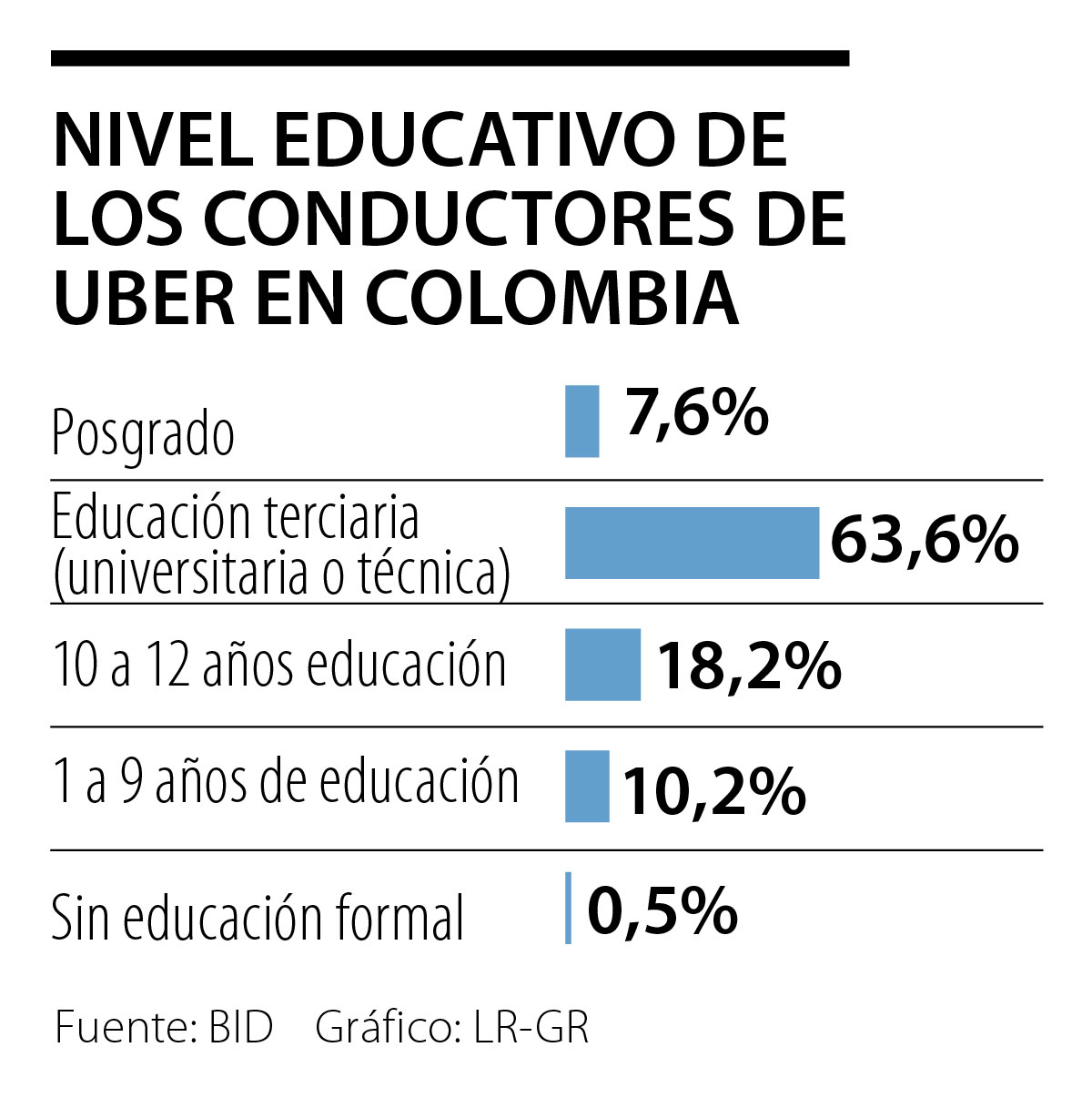 Así, los conductores de Uber colombianos son más educados que el promedio de la población en general, en la que solo el 17% tiene más de 12 años de educación, según la encuesta nacional de hogares, citada por el BID.