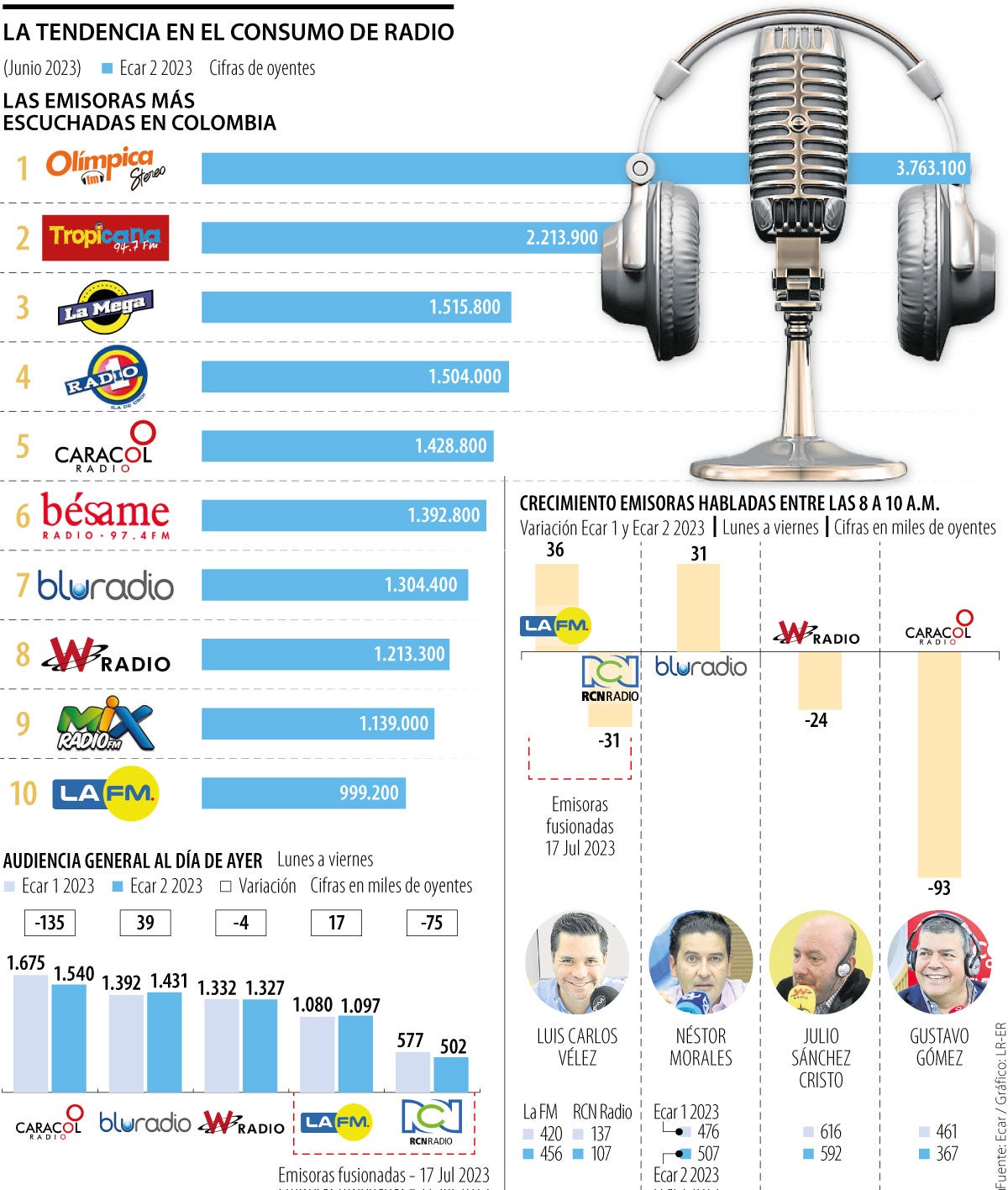Esta fórmula ha hecho que Olímpica sea la líder absoluta en audiencias, al llegar a 3,76 millones de oyentes, seguida de Tropicana, con 2,21 millones. El podio lo cierra La Mega, que acumula 1,51 millones, y el top cinco termina con Radio Uno (1,50 millones) y Caracol Radio (1,42 millones).