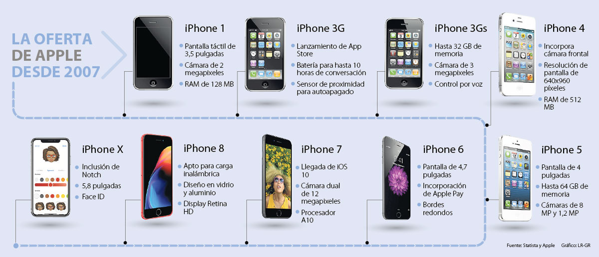 Desde esa fecha, la marca ha presentado anualmente un nuevo teléfono móvil, llegando el año pasado a incluir dos versiones diferentes de su apuesta en smartphones: el modelo iPhone 8 y el iPhone X, que conmemoraba los 10 años del lanzamiento del primer equipo.