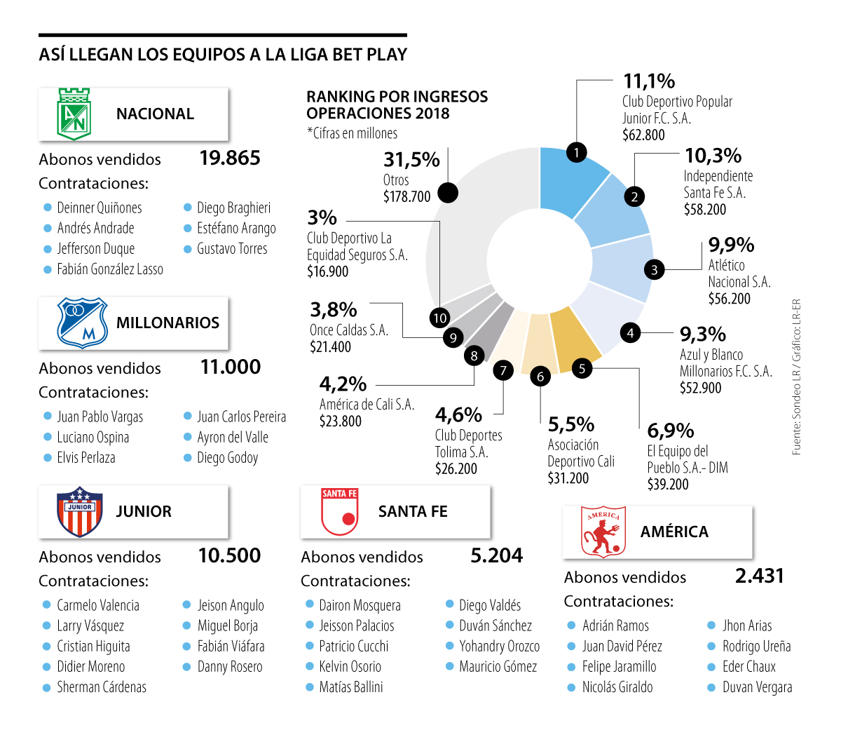 Por el lado de Millonarios, el plantel arranca como el tercero más caro de la liga colombiana (US$24,5 millones). El embajador, ganador de la liga en 2017-II, tiene que apostar fuerte por el torneo local y la Copa Suramericana y en sus filas incluyó a Juan Pablo Vargas, Luciano Ospina, Elvis Perlaza, Juan Carlos Pereira, Ayron del Valle y Diego Godoy. Además, a la dirección técnica del equipo llegó Alberto Gamero, y logró 11.000 abonados para esta temporada.