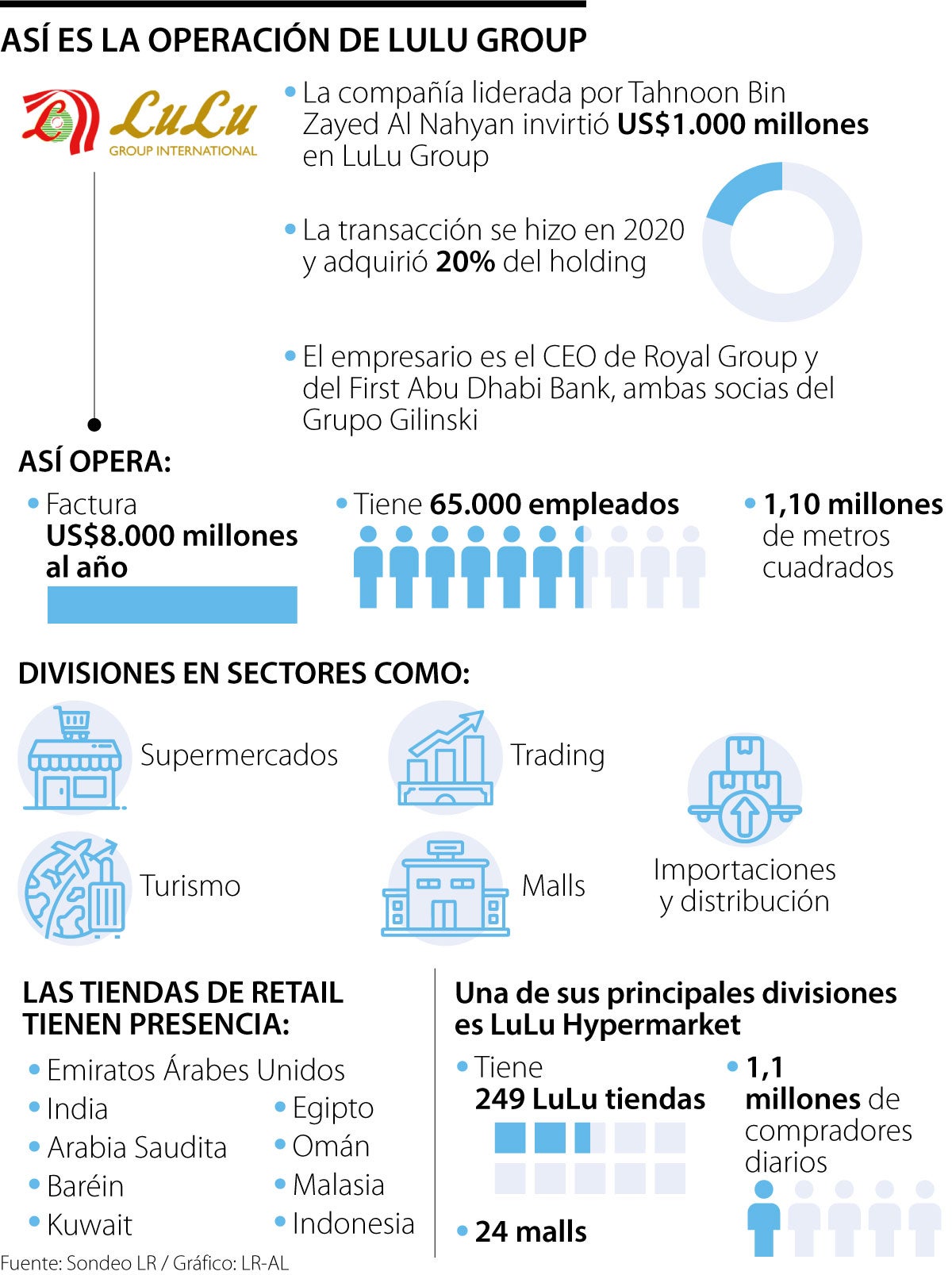 Al Nahyan no es ajeno a las inversiones en supermercados, pues en 2020 destinó US$1.000 millones por 20% de la participación en Lulu Group, una holding que tiene presencia en varios sectores. El conglomerado fue fundado en 2000, con sede central en Abu Dabi y posee una de las cadenas de retail o de alto consumo más grandes de Asia y Oriente Medio. Además, factura US$8.000 millones al año, tiene en su nómina a 65.000 empleados y ha creado una red de 249 tiendas minoristas que ocupan 1,10 millones de metros cuadrados.