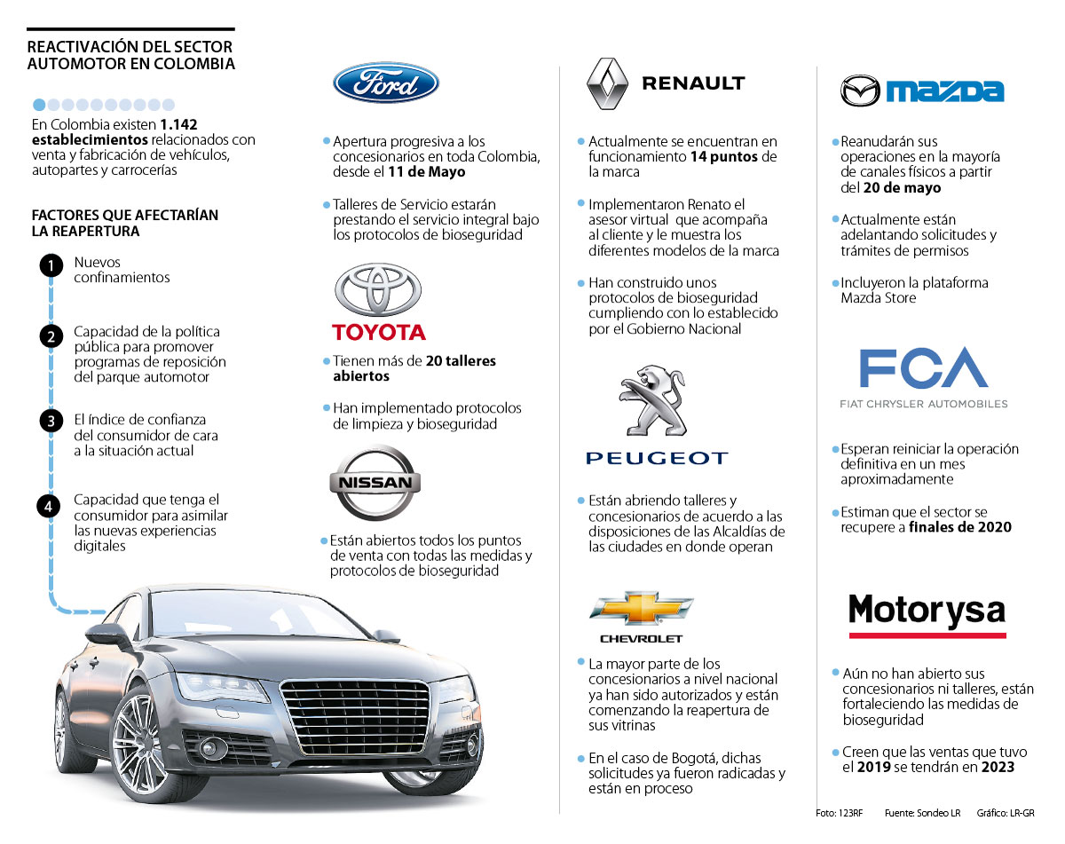 La industria automotriz ha sido uno de los sectores de la economía en Colombia que más se ha visto afectado por el covid-19, ya que, desde el inicio del período de aislamiento decretado por el Gobierno Nacional, se suspendió el total de sus operaciones. Sin embargo, ya empezaron a abrir sus operaciones diferentes marcas.