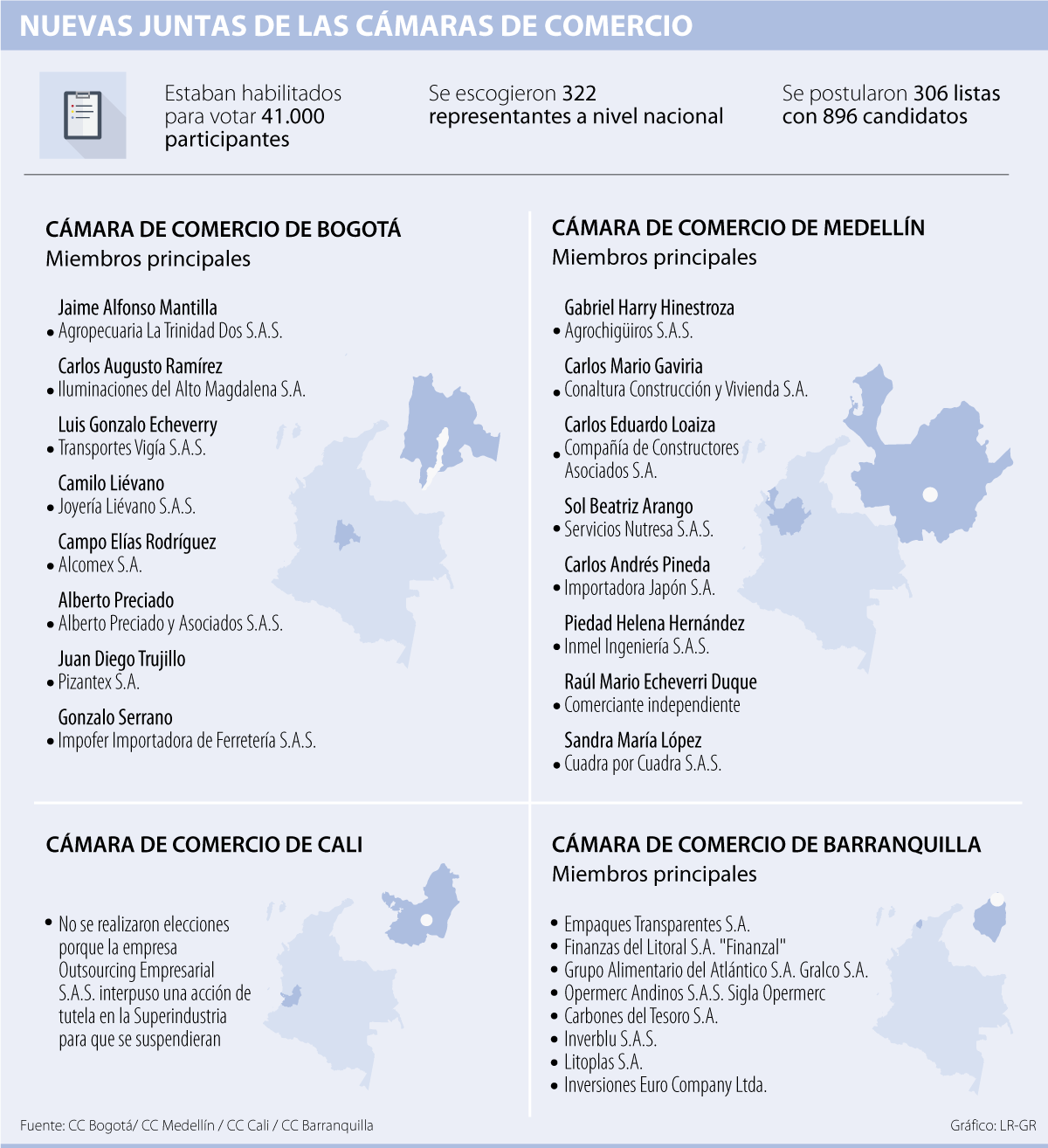 En las elecciones de la Cámara de Comercio de Medellín, donde se contabilizaron 816 votos válidos, se reportó que los ocho miembros principales de la junta son: Gabriel Harry Hinestroza, de Agrochigüiros S.A.S; Carlos Mario Gaviria, de Conaltura Construcción y Vivienda S.A; Carlos Eduardo Loaiza, de Compañía de Constructores Asociados S.A; Sol Beatriz Arango, de Servicios Nutresa S.A.S; Carlos Andrés Pineda, de Importadora Japón S.A; Piedad Helena Hernández, de Inmel Ingeniería S.A.S; Raúl Mario Echeverri Duque, quien es un comerciante independiente, y Sandra María López, de Cuadra por Cuadra S.A.S.