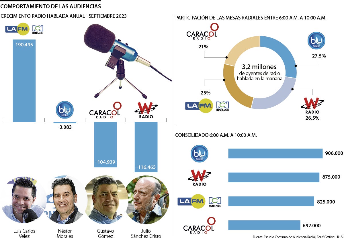En las cifras, varias de las principales cadenas de radio hablada vienen reportando caídas en sus números de oyentes en lo que va de año, pero resalta La FM de RCN, liderada por el economista Luis Carlos Vélez que, por el contrario, repunta, pues ha sumado 190.495 oyentes a septiembre de 2023. Además, por primera vez, la empresa de radio figuró en el top cinco de las más escuchadas en la franja 6:00 a.m. 10:00 a.m. Es una cadena radial que en julio de este año fue noticia, pues se fusionó con los noticieros de la cadena básica. Ahora, emite para 34 ciudades y 763 municipios a través de 47 emisoras, teniendo así una de las redes más grandes gracias a su cubrimiento en el país.