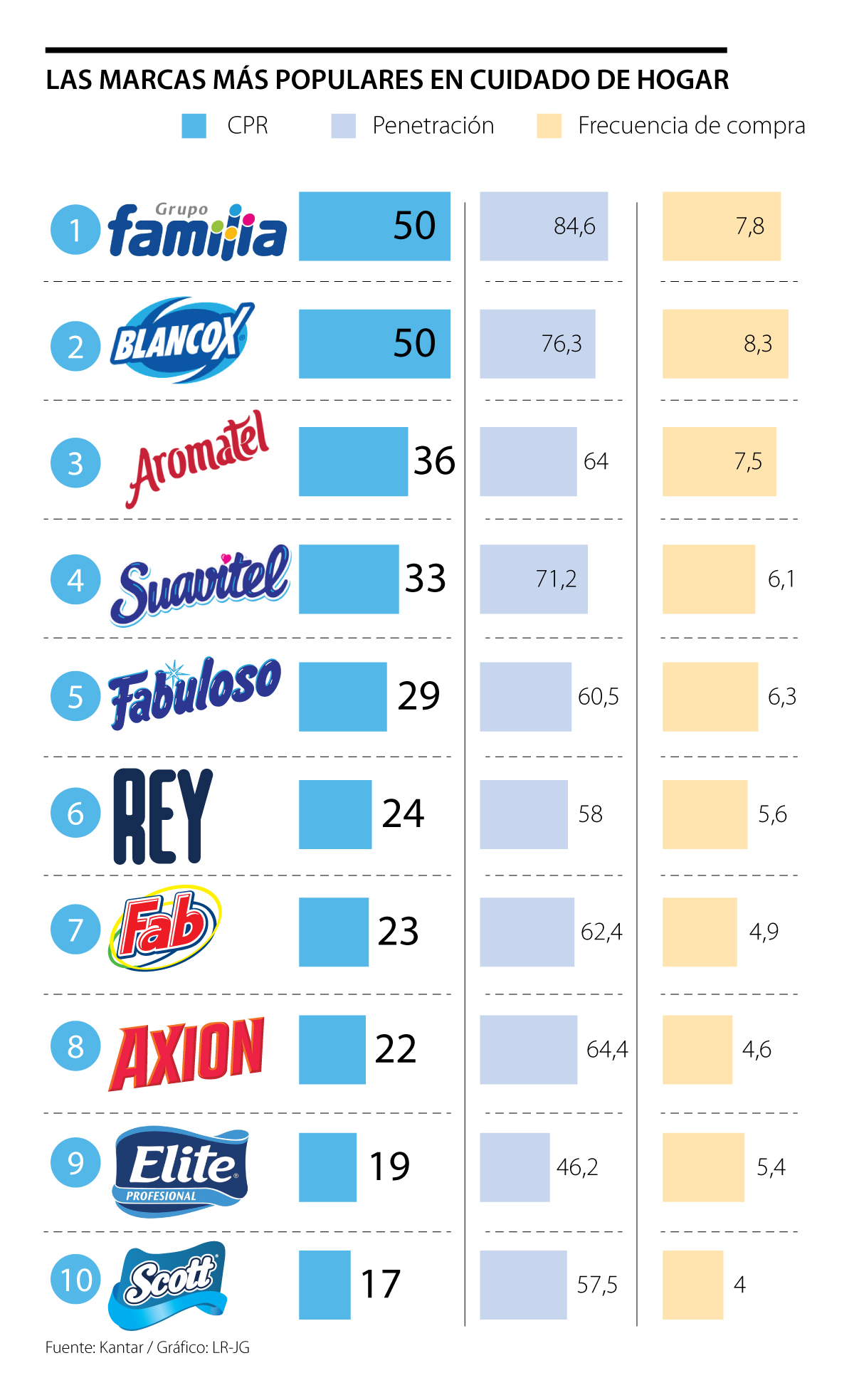Sin embargo, el estudio de Kantar también muestra que Familia, Blancox, Aromatel y Suavitel llegaron a esa posición pese a que disminuyeron las veces en que los consumidores las prefirieron frente a otras durante el año. Apenas hasta el quinto lugar, ocupado por Fabuloso, se reporta un crecimiento de este factor en la marca por la que se estaba preguntando.
