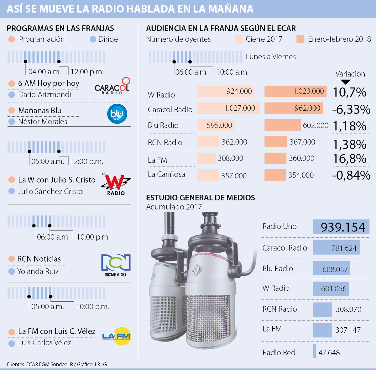 Sin tener en cuenta a quienes se enfocan en la radio musical, son cinco las emisoras que habían mantenido protagonismo en este ámbito durante años pasados en el horario que comprende las 6:00 a.m. y las 10:00 a.m. entre lunes y viernes: La W, Caracol Radio, RCN Radio, La Cariñosa y Blu Radio. Este año, se acrecentó la participación de una nueva apuesta: La FM.